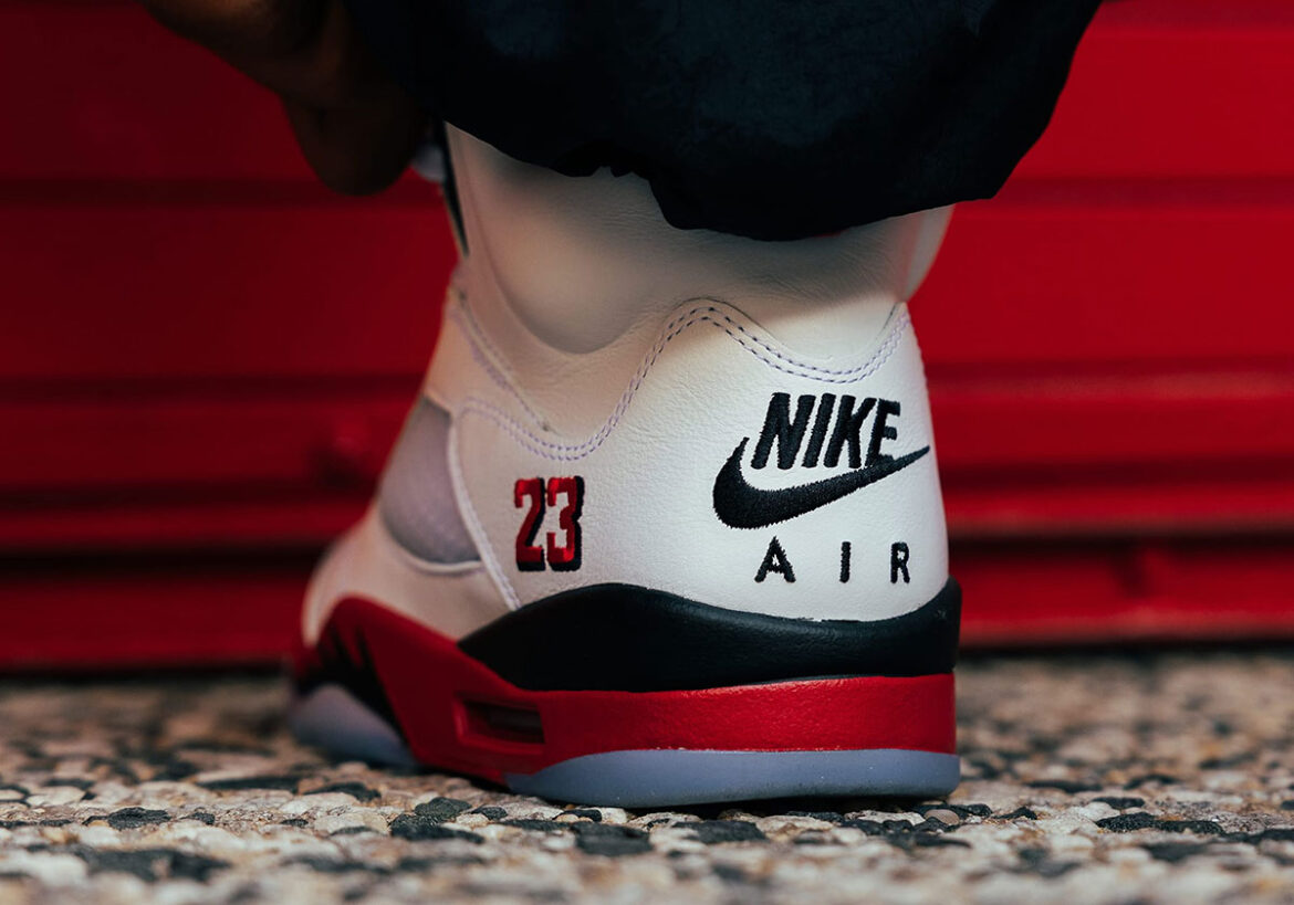 Two versions of the Jordan 5 “Fire Red” released in 1990, one of which serves as the inspiration behind this 2025 retro. The other featured a silver tongue, red “Nike Air” text, an inverted black/red midsole, and no “23” stitching on the lateral side. Both versions have retro’d multiple times since their debut, but the silver tongue has historically been more common.