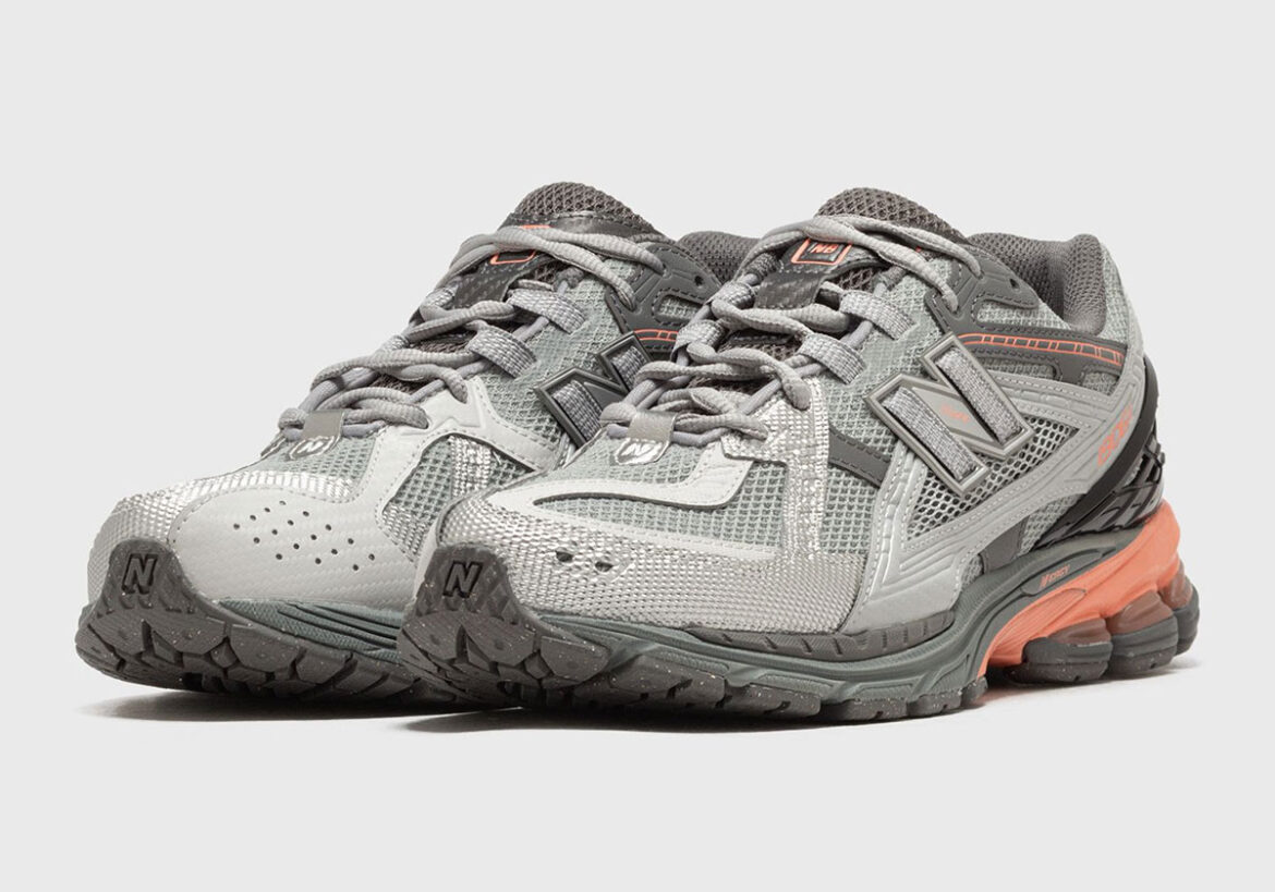 The New Balance 1906U here picks up a familiar, flashy aesthetic, taken with multiple shades of grey, white, and silver. A salmon-colored accent on the lateral side of the midsole is the main point of appeal, complemented by a black heel counter and more salmon accents placed sporadically up top.