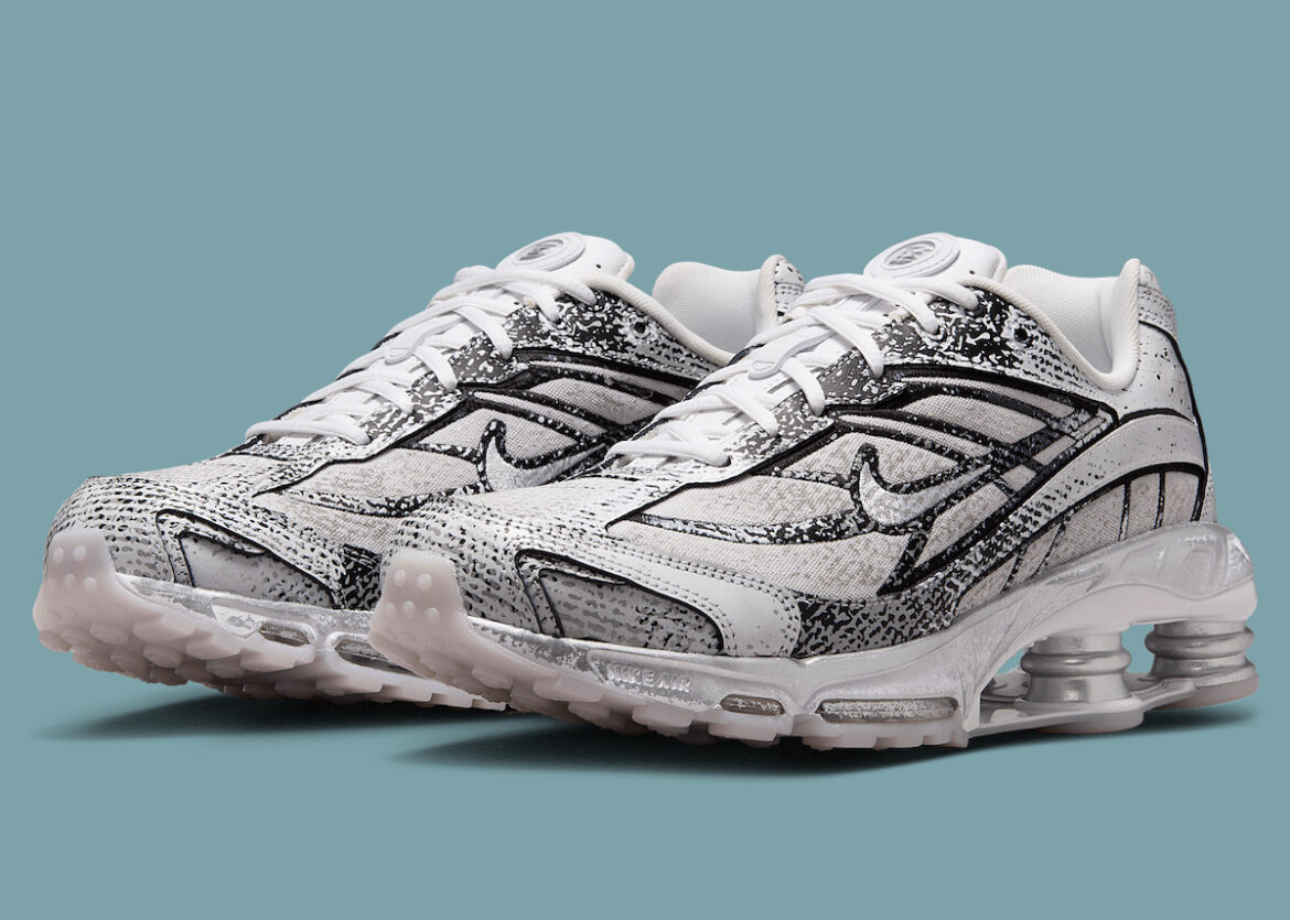 The upper is dominated by a unique scuffed black-and-white graphic that gives the sneaker a pre-worn, textured look. Chrome accents enhance the futuristic appeal, while the iconic Shox columns in metallic silver add a dynamic, retro touch. The design balances heritage and innovation, highlighting Nike’s commitment to pushing boundaries while celebrating its past.