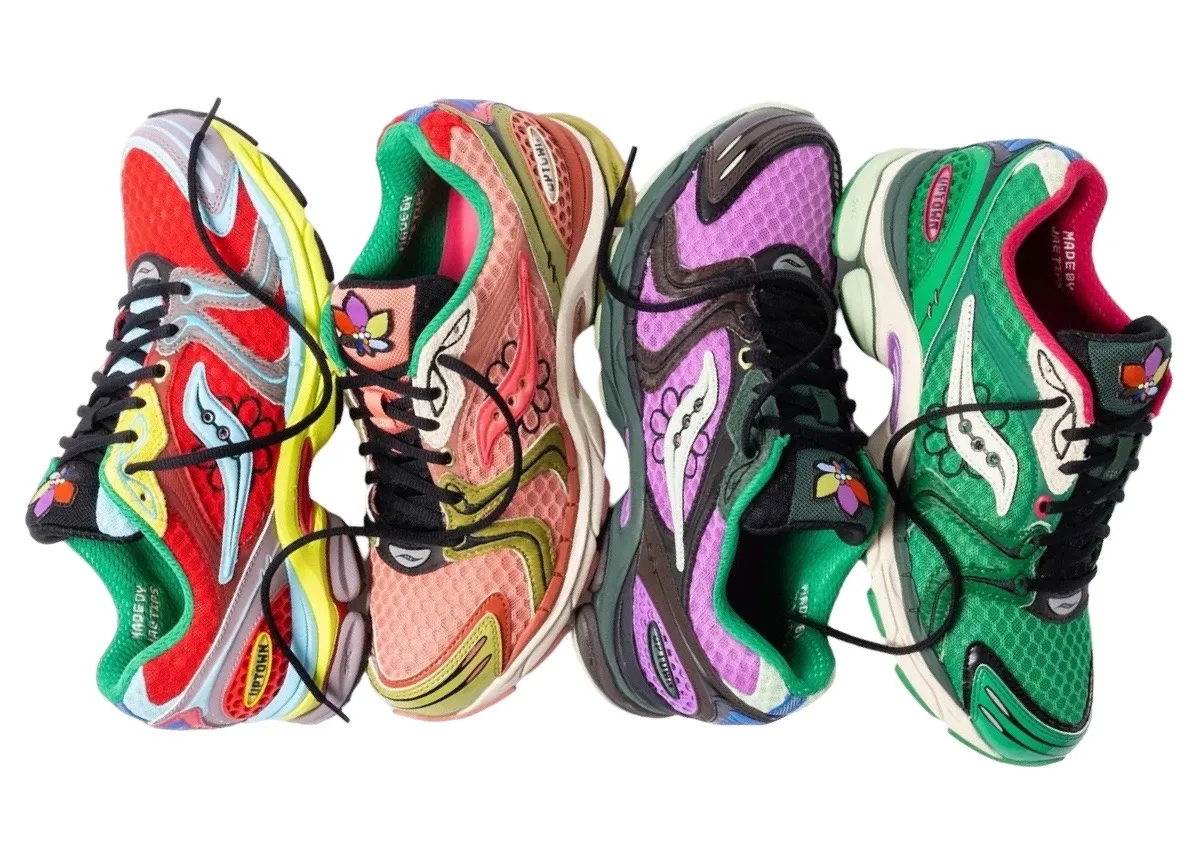The latest capsule, titled “Flowers Grow Uptown”, features four blooming colorways in red, pink, purple, and green. These vibrant Saucony sneakers use bold mesh bases with glossy leather overlays and petal-filled graphics throughout. You’ll find floral details on the tongue and midfoot, plus “UPTOWN” stitched onto the heel instead of the usual “ProGrid.” That’s a nod to Jae Tips’ Bronx upbringing.