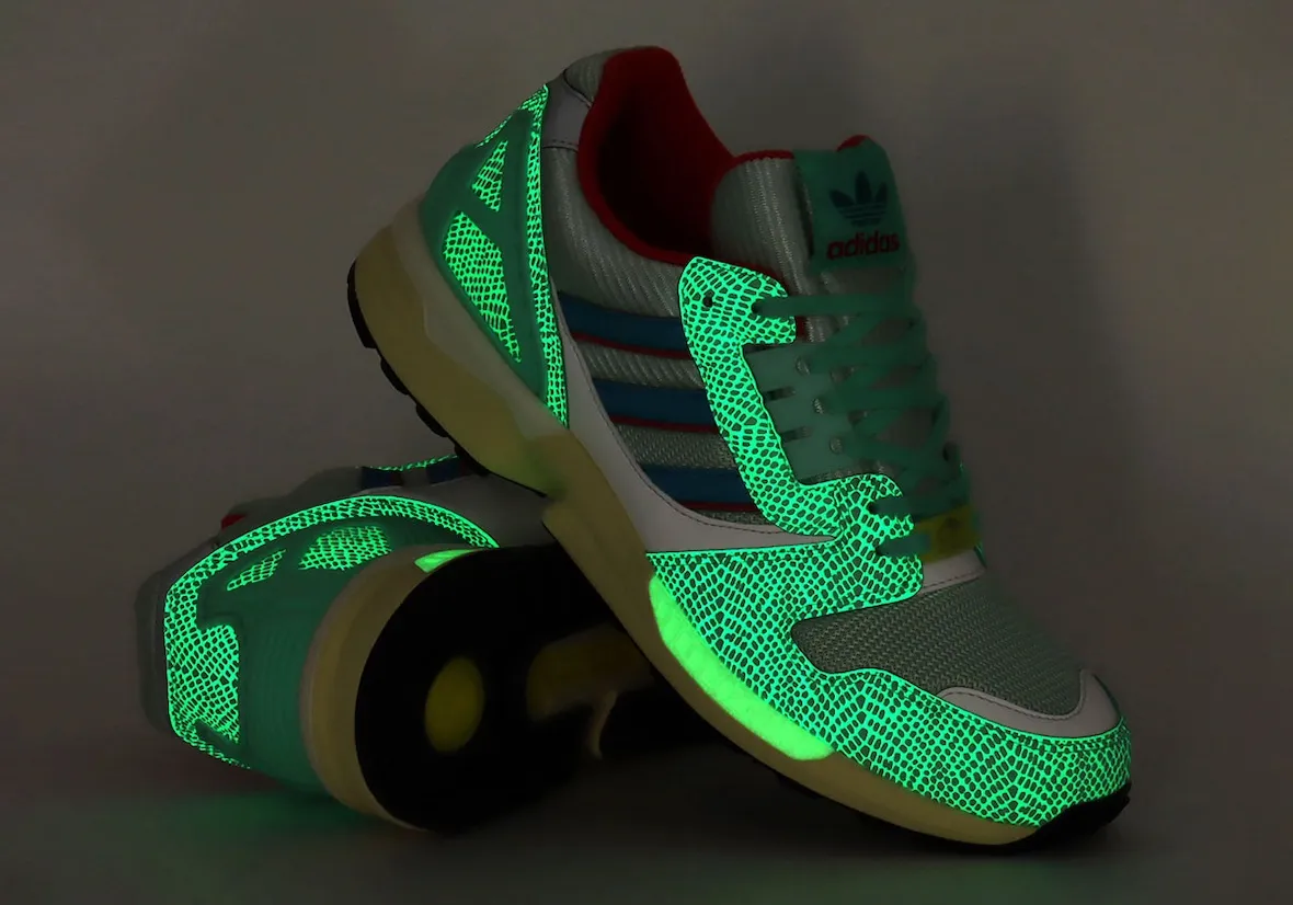 If previous G-SNK models are any indication, this chapter should be no different in its knack for striking designs. Luckily for sneakerheads with less adventurous taste, this version tones things down—at least during daylight hours. A white mesh base is accented by mint green overlays, blue Three Stripes and pops of red. It’s all a balanced contrast, and the off-white midsole further speaks to classic ZX silhouettes of old. But sneakerheads know the real fun happens after dark, as glow-in-the-dark overlays are strategically applied to the snakeskin, bathing the panels in light. It’s a masterful way to nod to the G-SNK series’ most distinct calling card, while keeping things as eye-catching as ever.