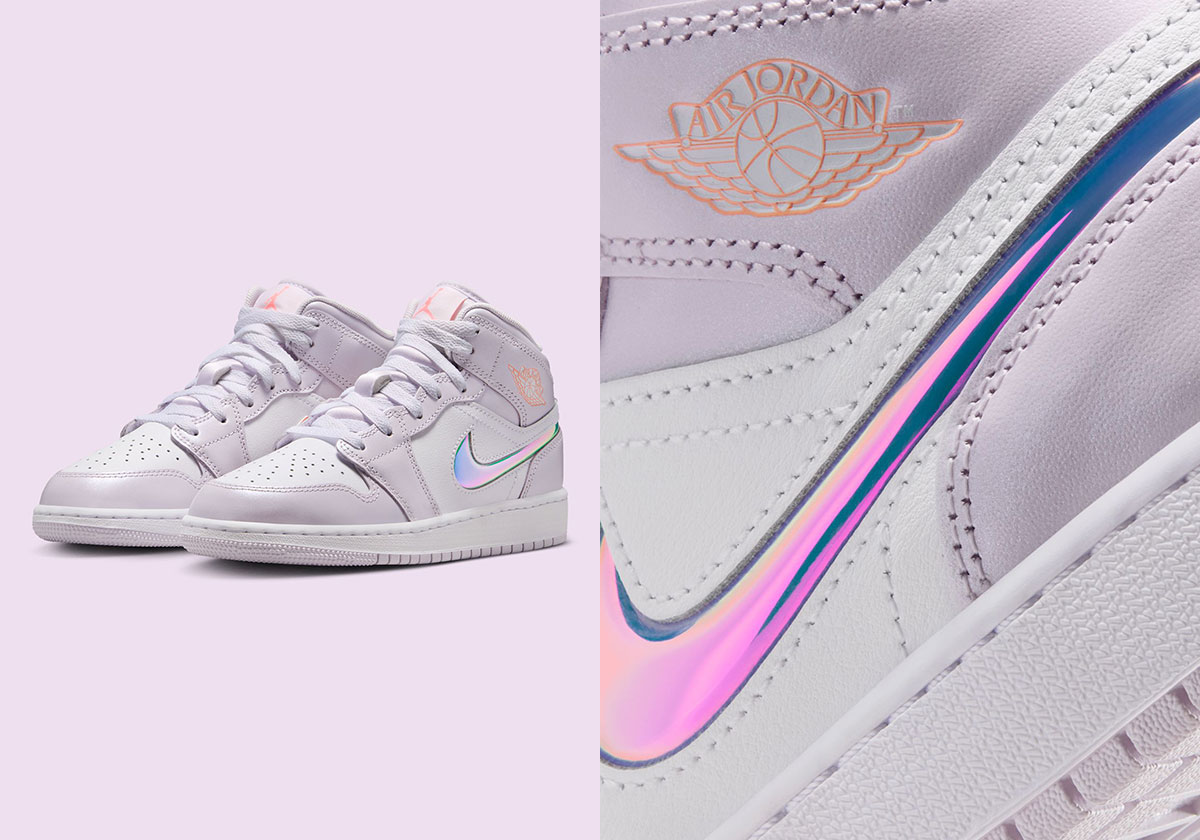 Recently seen on our front page with a spree of food-related editions, the Air Jordan 1 Mid has taken to every manner of animated colorway, utilizing patterned panels, new branding, and everything in between to appeal to the younger set. Relative to those more transformative versions, the one at hand is almost toned down, beginning with a smattering of tonal pinks and purples across its body. Where things truly start to (literally) shine is in the Swoosh, which carries a metallic lenticular finish that’s also echoed in a rainbow-like hangtag that emphasizes this core design principle.