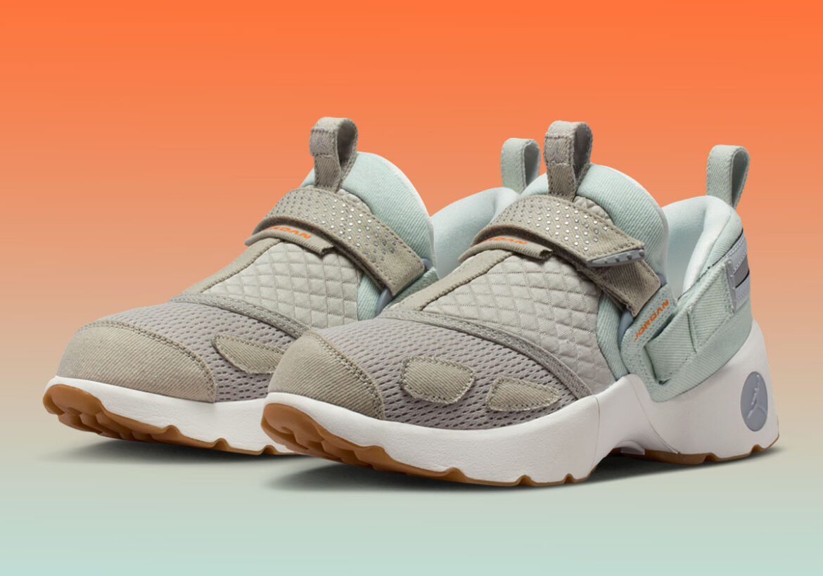 Favoring soft over sporty tones, the Trunner LX arrives in a muted mix of beige and light robin’s-egg blue across the upper. The standout feature — and one that underscores the shoe’s shift into lifestyle territory — is a texture swap to corduroy. Beige corduroy covers the toe cap and adjacent panels, while the heel and the model’s distinctive straps are finished in light blue corduroy. Orange “Bright Ceramic” accents pop on the “Jordan” text and Jumpman insoles, while a “Summit White” midsole and “Gum Light Brown” outsole complete the look underfoot.