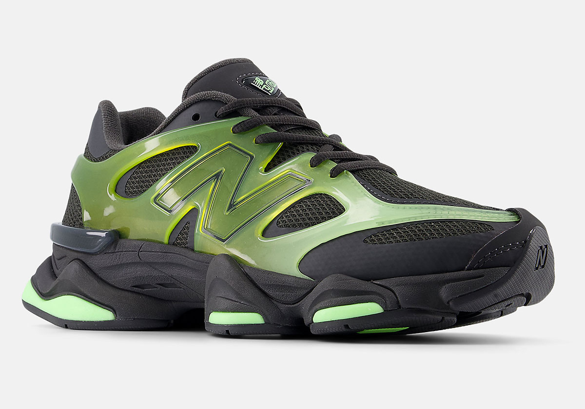 Reminiscent of Nickelodeon’s slime (and maybe even an Attitude Era wrestling faction), the New Balance 9060 X highlights its defining feature with a semi-clear TPU cage in light green. The rest of the upper, including slim synthetic protective panels running beneath the cage, comes in black. Underfoot, the ABZORB and SBS-cushioned sole unit adds subtle flashes of lighter green along the sides and outsole.