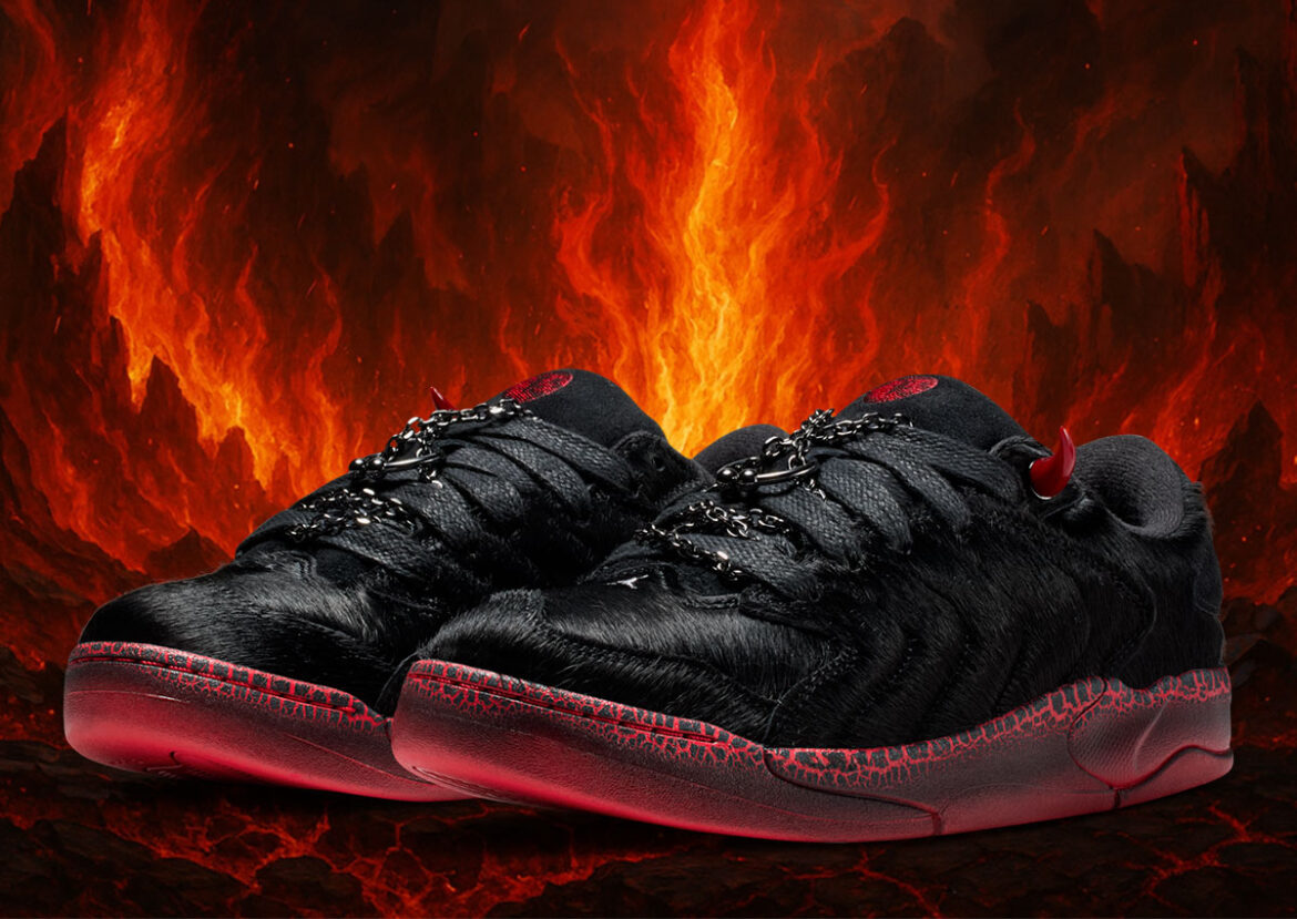 Inspired by the meaning of its SKU (IM6666-066), the sneaker completely embraces satanic imagery. The lower half of the upper is made of faux pony hair in a jet black hue with silver chain accents, and a nose-ring on the tongue below stitching that outlines piercing eyes. The ominous details don’t end there, as the top eyelets are replaced by ruby-red horns.