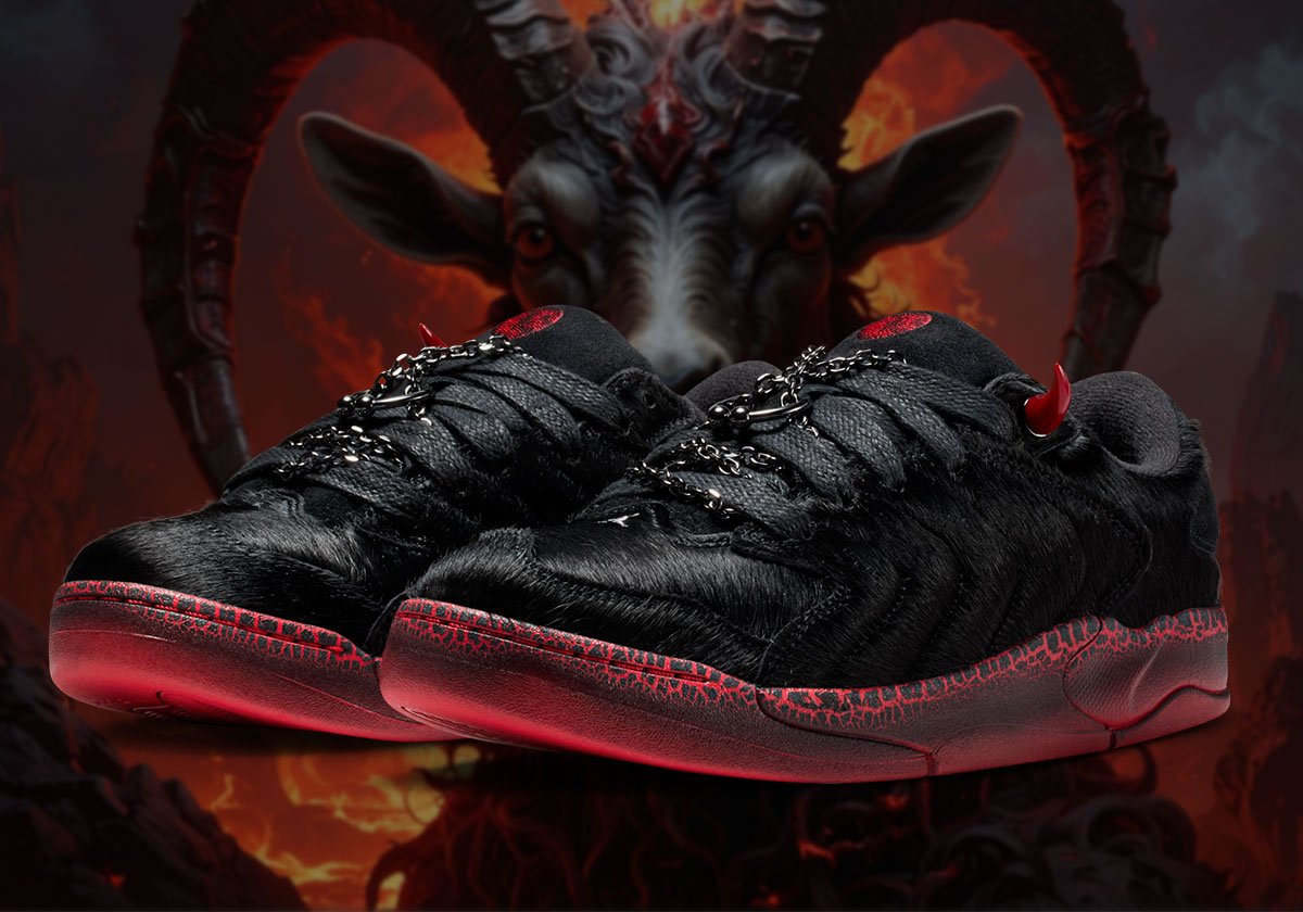 There’s no detail left untouched. The upper is cover in a black hairy exterior, while red horns protrude from the upper eyelet. Ghoulish eyes appear on the tongue, while the cracked graphic on the midsole appears more like scorched earth. Whether intended or not, this release appears to be inspired by Baphomet, the devilish goat often associated with Satanism. The details continue via the silver chains tangled with the black shoe-laces, while a silver septum barbell ring dangles off the lace-loop on the tongue.