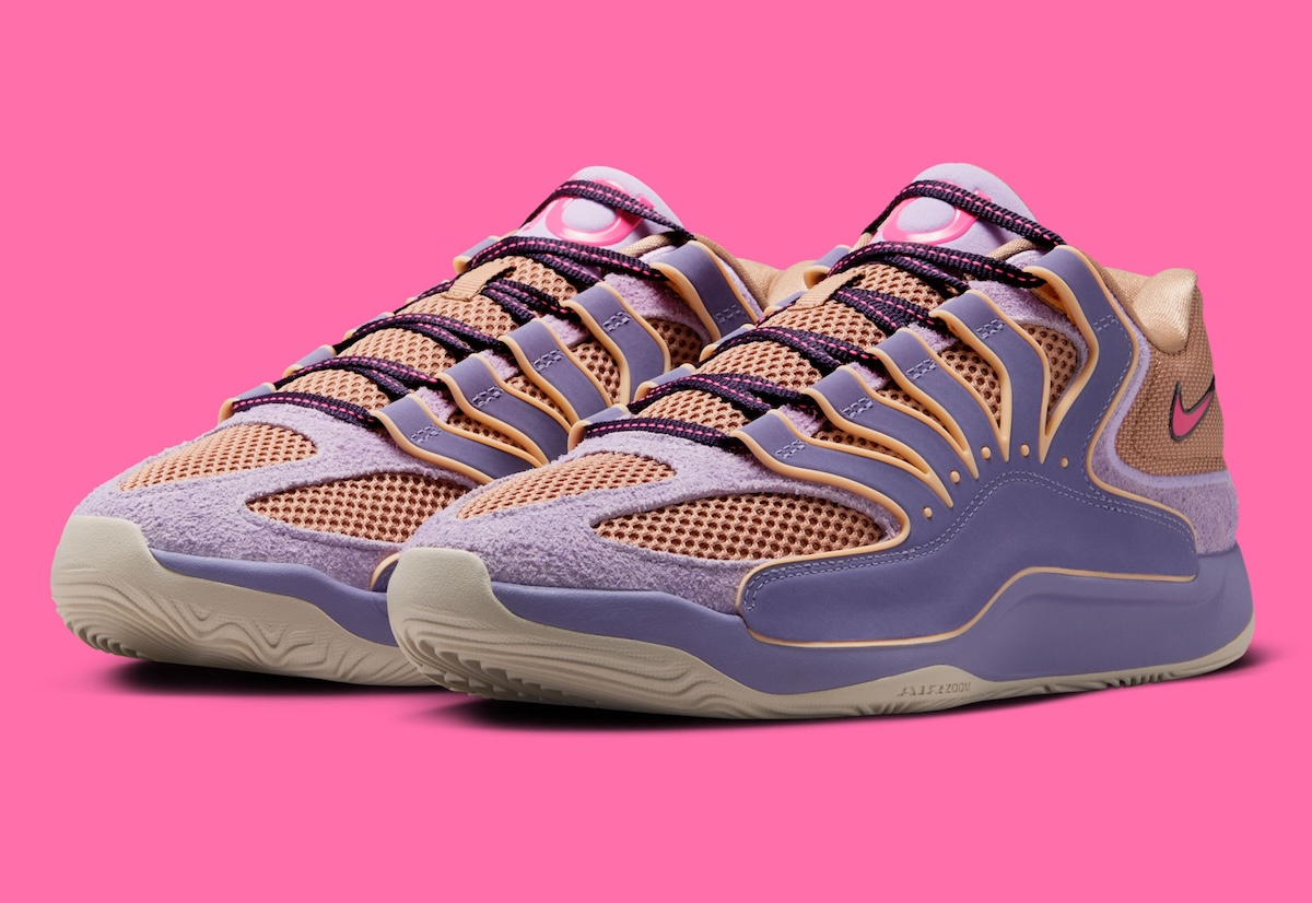 Durant’s latest pair opens the colorway to include a lavender base, Fire Pink accents, and warm Hemp tan overlays. The color mix is unique, vivid, and colorful. It offers up new visuals for Durant’s ongoing story while taking the series into new directions. To further pay homage to his grandmother, check out small but significant details like the “B.A.D.” embroidery at the heel.