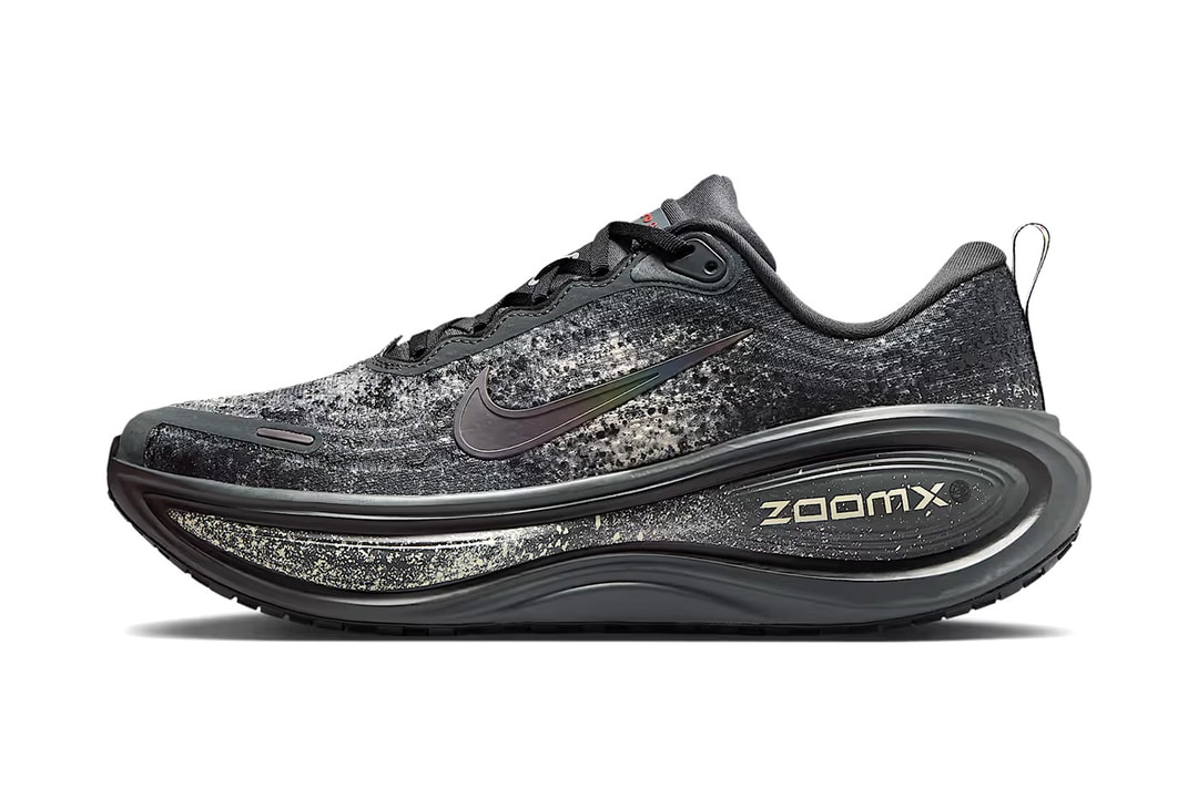 The “Anthracite/Oatmeal” colorway complements this design ethos with a breathable engineered mesh upper, featuring a muted base overlaid with a textured, splattered pattern in black. This distinctive splatter design is echoed on the ZoomX midsole for a near-seamless, unified look. Meanwhile, solid black elements frame the sole unit for a streamlined look. This aesthetic is further unified by a stealthy palette on the sockliner, tongue and the debossed lateral Swoosh logos. Subtle, iridescent accents punctuate the sneaker on the toe and the Vomero Plus tongue label, while a miniature metallic silver Swoosh adds a final touch of detail between the laces and the toe box.