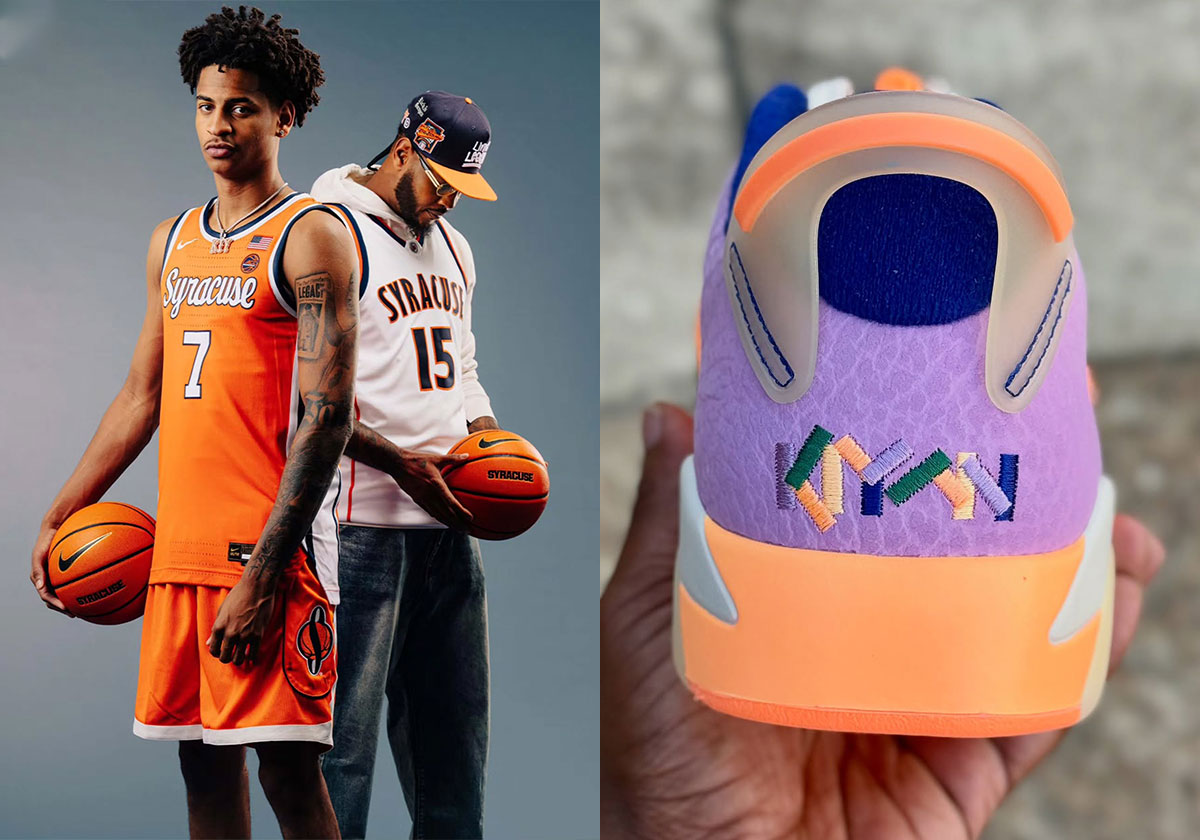 Coming to light with the help of SLAM Kicks, the Syracuse Orange commit brings plenty of school spirit to the fore, with orange and blue shining through in a wild multicolor arrangement. More intriguingly, this Air Jordan 6 Low functionally swaps textures every time it switches color: scaly leather holds up orange at the quarter, elephant print suede defines the lavender heel cup, royal blue prints on the perforated leather toe cap, and forest green hits the “23” suede that zigzags from the laces.