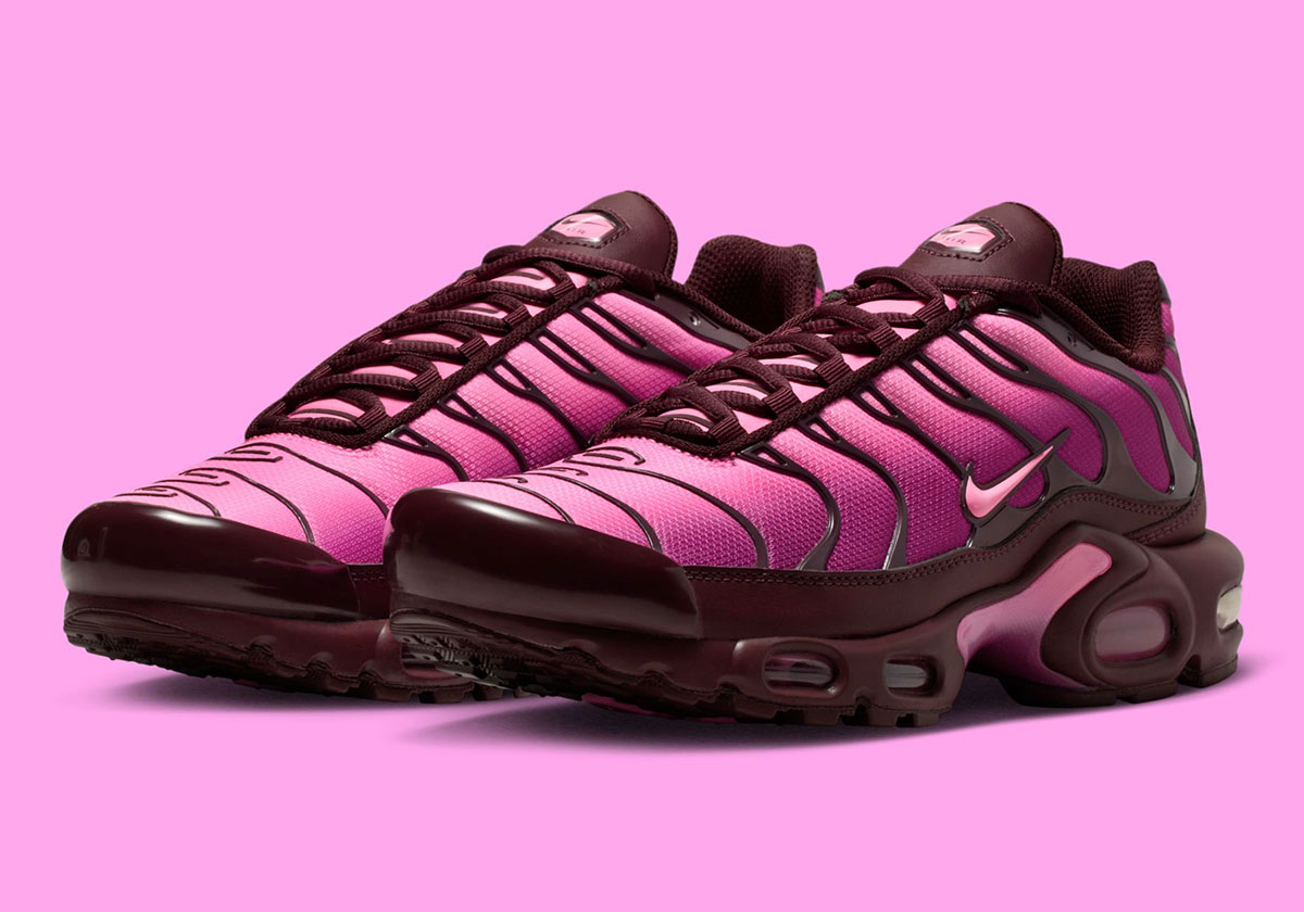 Scheduled to arrive this Holiday 2025 season is a brand new mix of Burgundy Crush, Cactus Flower, and Pink Spell. The trio of shades work fluently to create a look appealing to both women and men thanks to the dark red mid-sole and lava-esque overlay as well as the purple-to-pink fade on the mesh upper. Nike further matches the outsole beneath the Tuned Air coils with the pink upper for the must-have matching, while the classic yellow appeared on the TN logo at the heel.