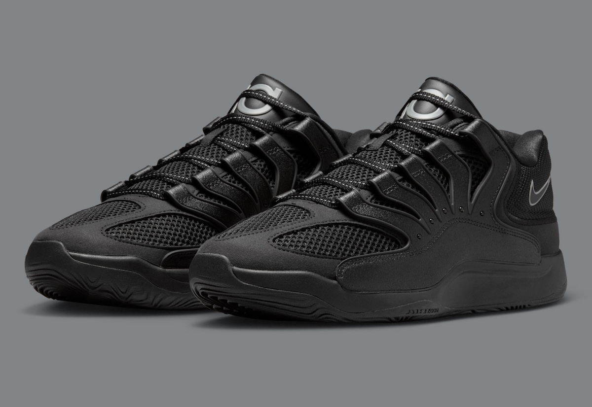 Decked head-to-toe in black, the upper features layered mesh and hardy overlays along with reflective TPU ribs that wrap the foot and act as lace support. It’s a nod to previous all-black KD iterations with an updated aggressive edge.