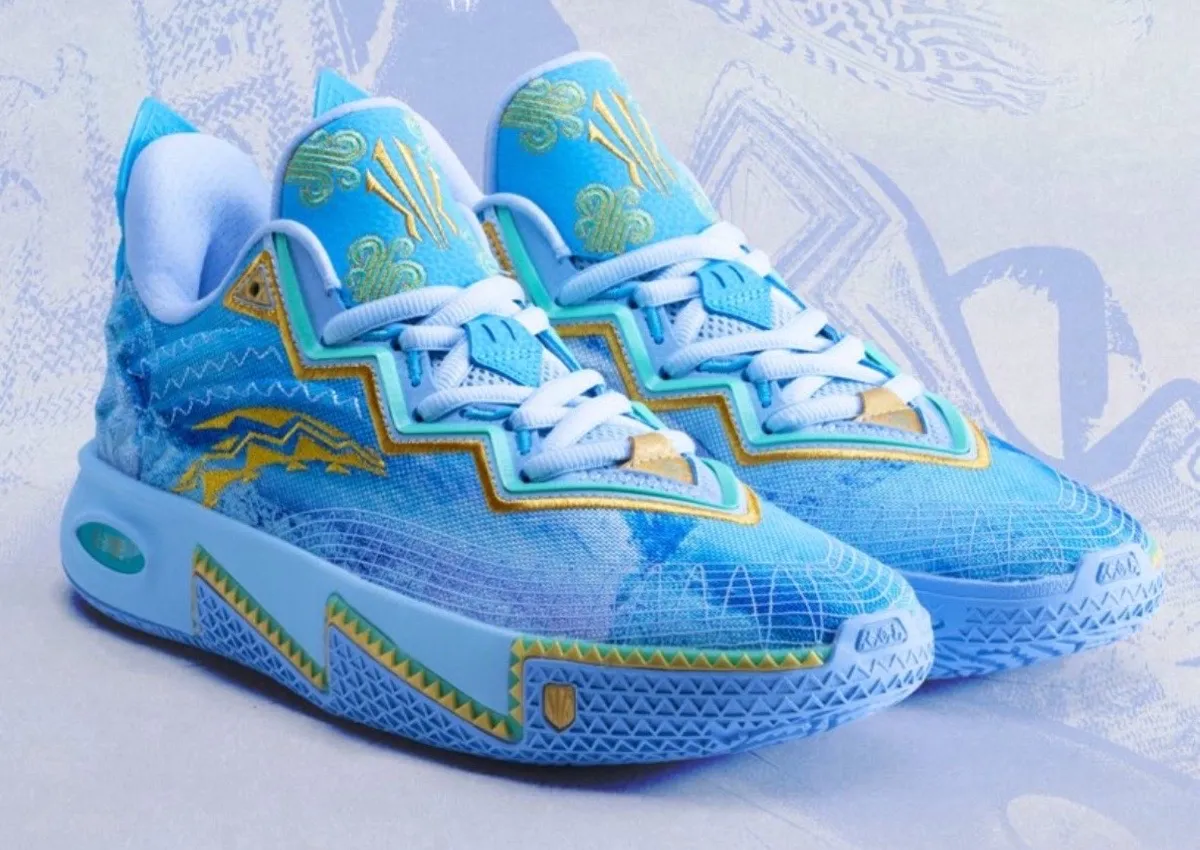 The “Klay” colorway is an interpretation of Thompson as air, and Irving as water. The upper has a mix of swirling blue tones with contrasting pops of bold gold embroidery. Green accents are also incorporated. Zigzag motifs reference the energy of the elements, while the use of various textiles bring structure as well as style. ANTA branding and personalized design elements emphasize the union of the two stars. These details help to distinguish this pair from previous colorways.