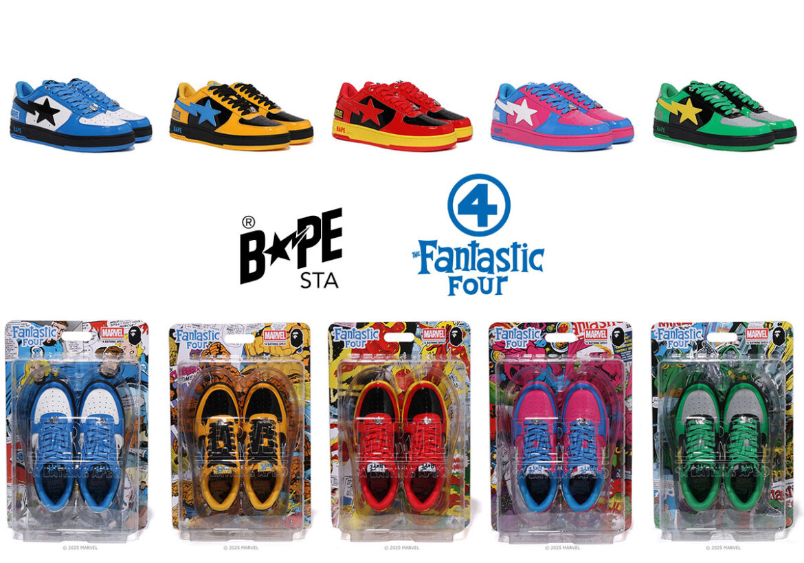 Unlikely allies they may be, but Stan Lee and Jack Kirby’s comic book universe has been one of the more reliable sandboxes for A Bathing Ape. First consummated with a 2005 Marvel Bape Sta collection bringing iconic heroes like Spider-Man, Thor, Iron Man, and the Hulk to life on the patent leather sneaker, the dawn of the MCU and the renewed interest brought the partners back together, now guided by later-cresting characters like Black Widow and Rocket Raccoon. With The Fantastic Four: First Steps completing its box office run, it’s high time for another chapter: the Marvel x BAPE “Fantastic Four” collection.