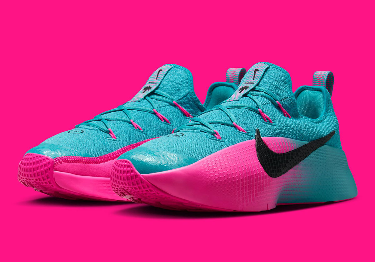The LeBron TR1 training shoe, which first released around this time last year, now does its best “South Beach” impression with a balanced mix of teal and pink. The shoe’s mesh upper appears entirely in teal with pink lace loops, while the midsole features a pink-to-teal gradient on the lateral side and solid pink on the medial. If there were any doubt about the inspiration, a palm tree graphic on the tongue pull tab seals the theme.
