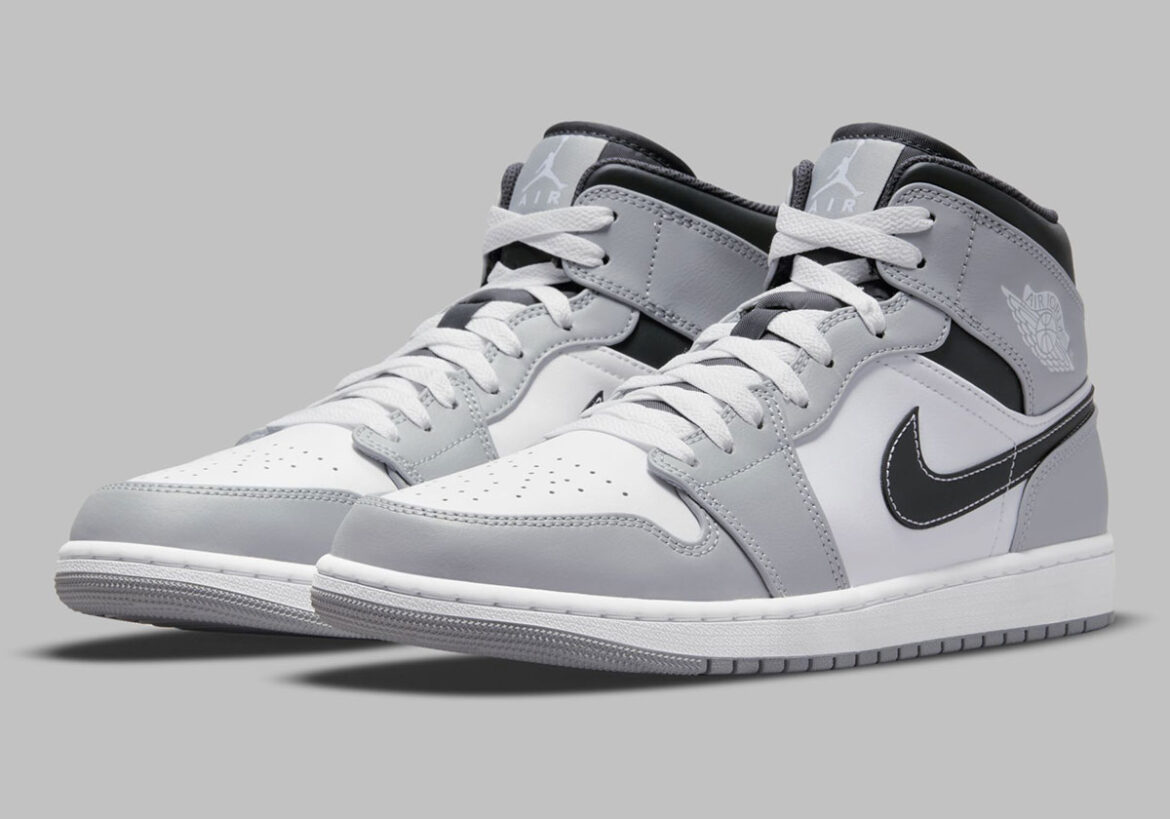 The Jordan 1 Mid “Light Smoke Grey” is the sneaker in question: a Barons-esque look featuring a white leather base, “Light Smoke Grey” overlays, and black on the collar, tongue, and Swoosh logos—each with white contrast stitching on both sides. Truthfully, Jordan Brand just recently dropped a Jordan 1 Mid “Barons” that more directly channels the memorable 2014 high-top of the same name, and it’s available now through Nike (see the linked text above).