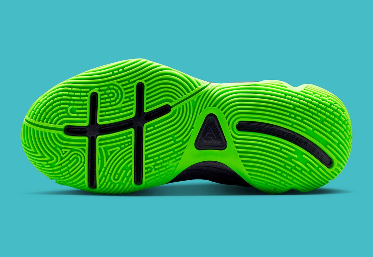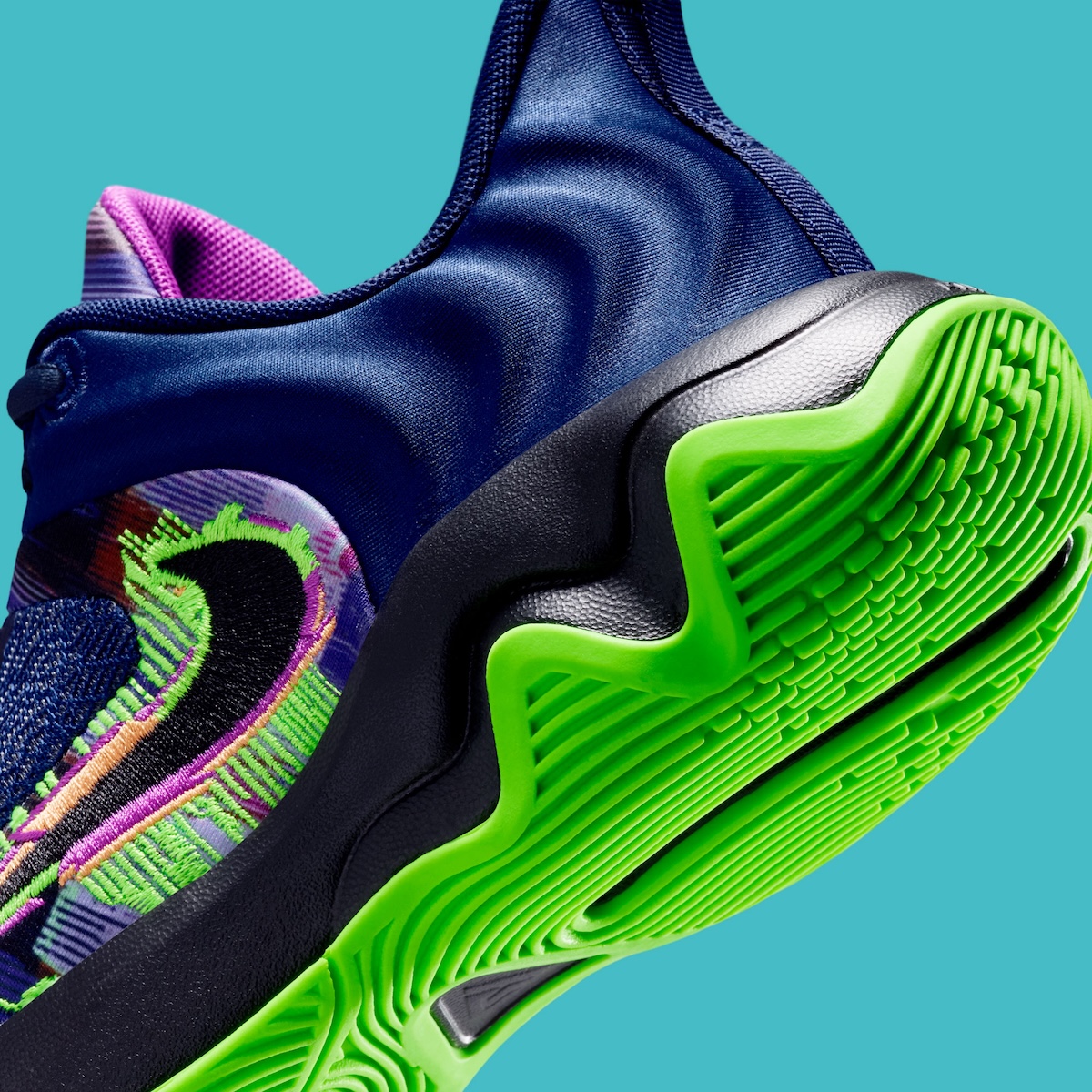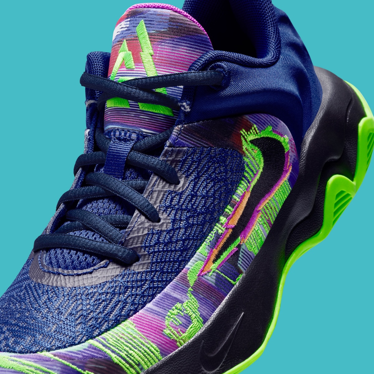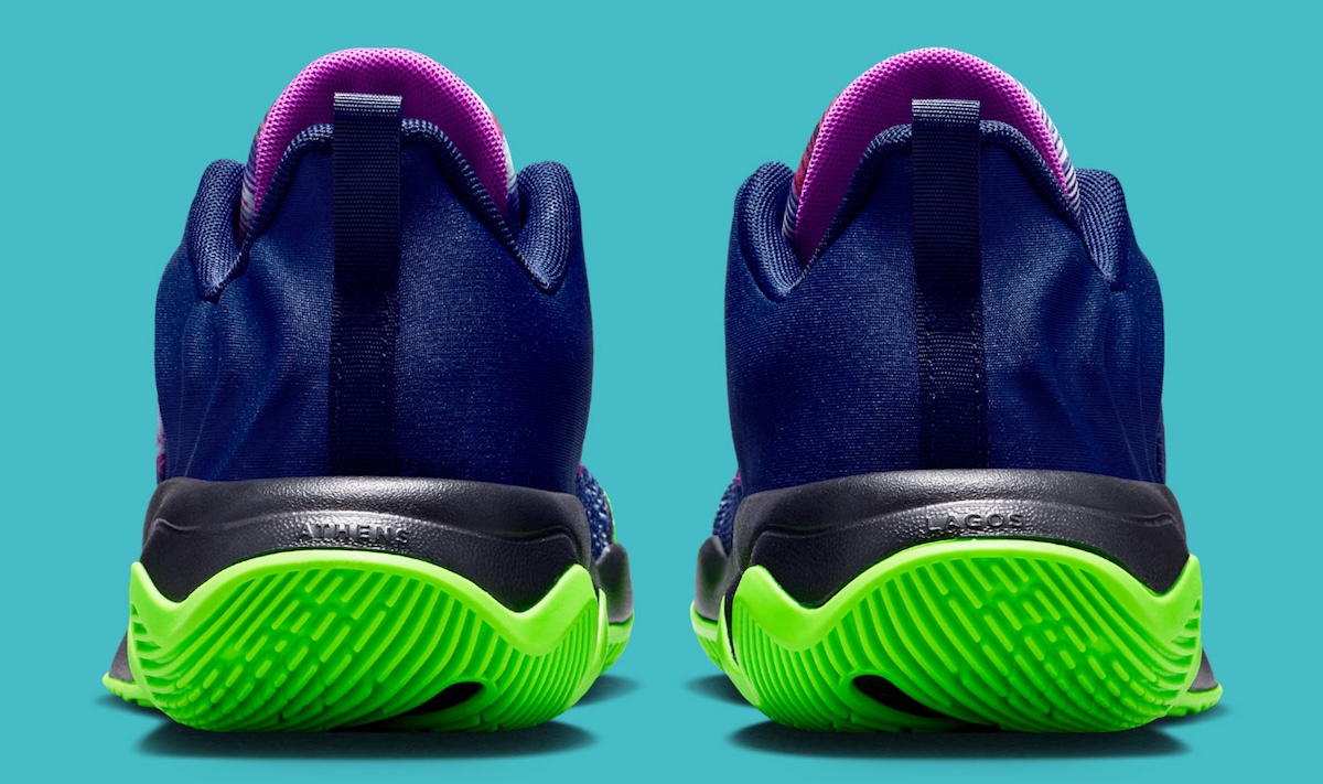 The Giannis Immortality 4 meshes performance and style with creative use of tech features. A navy woven base is accented with neon green, pink, and purple elements. A sculpted black midsole features a bright green outsole for grip. Giannis’ logo is embroidered on the tongue.