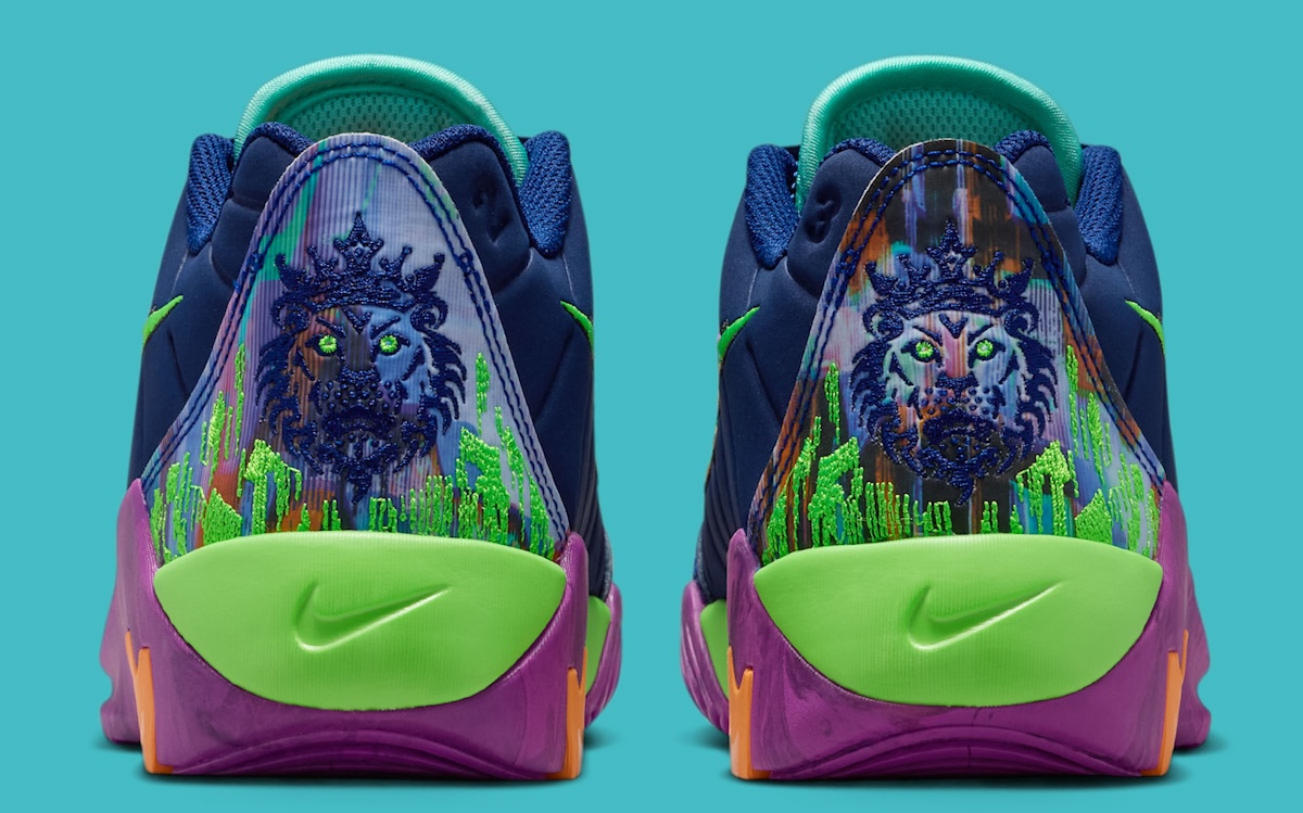 The LeBron Witness 9 showcases navy uppers with quilted side panels, and a stitched gradient Swoosh bordered in orange. Embroidered around the heel is a lion crest design which symbolizes LeBron’s performance in-game. The shoes feature a purple marbled midsole with neon green and orange accents.