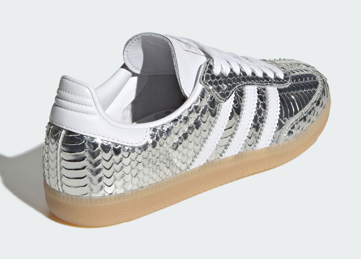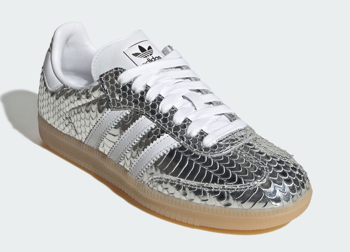 Available in Core Black/Off White/Gum Five and Silver Metallic/Footwear White/Gum Three, the respective pairings of the Samba’s silhouette takes on a glossy snakeskin texture. That’s the immediately noticeable first detail.