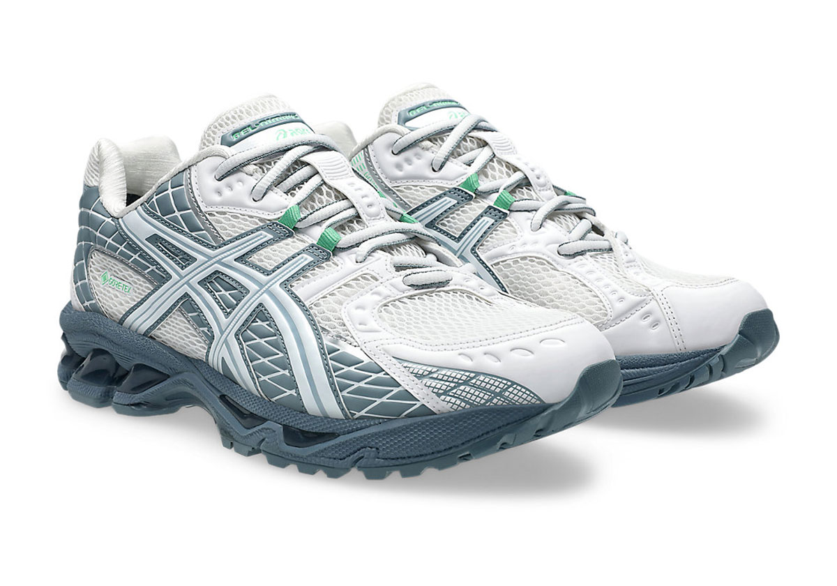 Most GORE-TEX sneakers that cross our desk feature flush, tight-knit exteriors designed to repel moisture. Not this GEL-Nimbus 10.1. Instead, it appears the model incorporates GORE-TEX underlays to preserve its signature airy mesh aesthetic. GORE-TEX branding appears in minty green in two locations: first on the heel of the lateral side and again in repeating fashion on the medial underlay. The rest of the design takes a fittingly icy approach, complete with a white leather toe, white mesh, and a hazy “Fjord Grey” shade across the sidewalls and Kayano 14 sole unit.