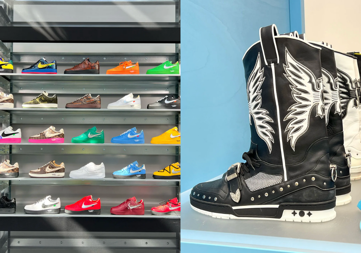 First up is an unfinished version of the ground-breaking Off-White x Air Jordan 1 “Chicago”; this version does not include the transparent nylon panels, Swoosh, stitching, wings logo, and “AIR” text on the midsole. Next is Virgil’s take on the Nike Cryoshot Tiempo; the off-the-pitch iteration of the iconic boot features all the DNA of the The 10 with a clean white upper, black “AIR” lettering, and red zip-tie hangtag. There was also a cowboy boot version of the Louis Vuitton Baskets, the mythical “Canary Yellow” Off-White Air Jordan 1, the unreleased “Bred” Off-White Air Jordan 4, and many more. All of the shoes (and much more) were displayed on the first floor of the exhibit.