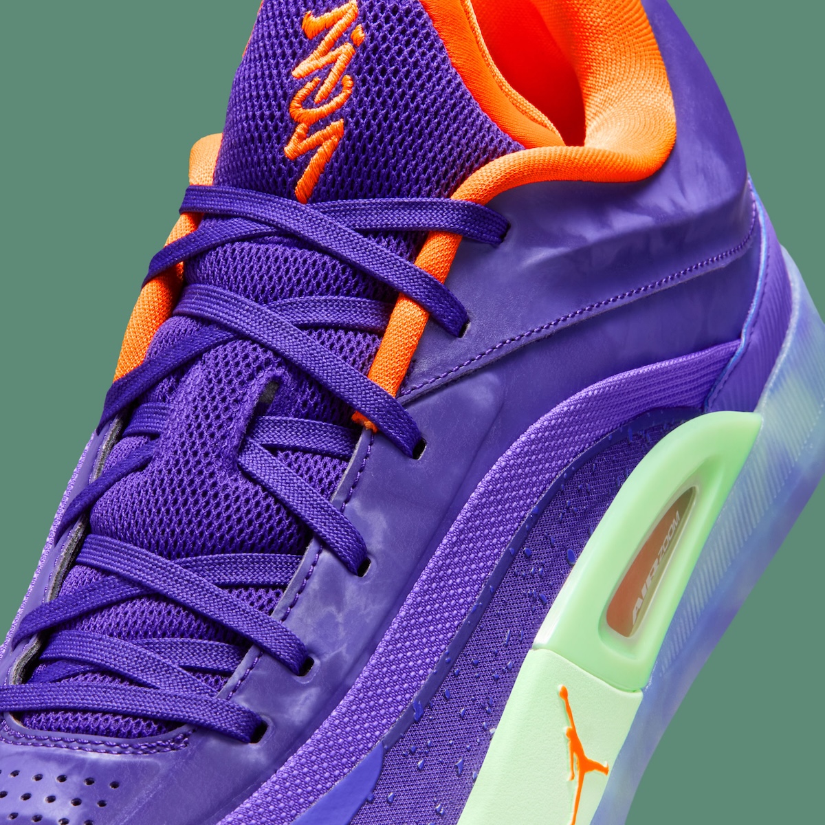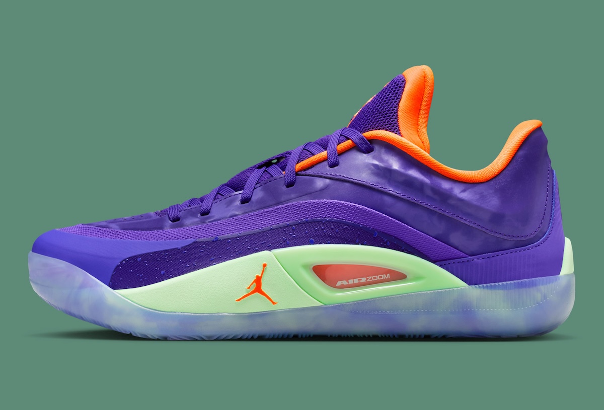Air Zoom units are accented with a green tint. Liner, tongue and heel branding are accented in orange. Zion branding is also visible on the heel and tongue of the shoe, while an icy translucent color is used for the outsole. A swirling graphic can also be found within the outsole in purple and green.
