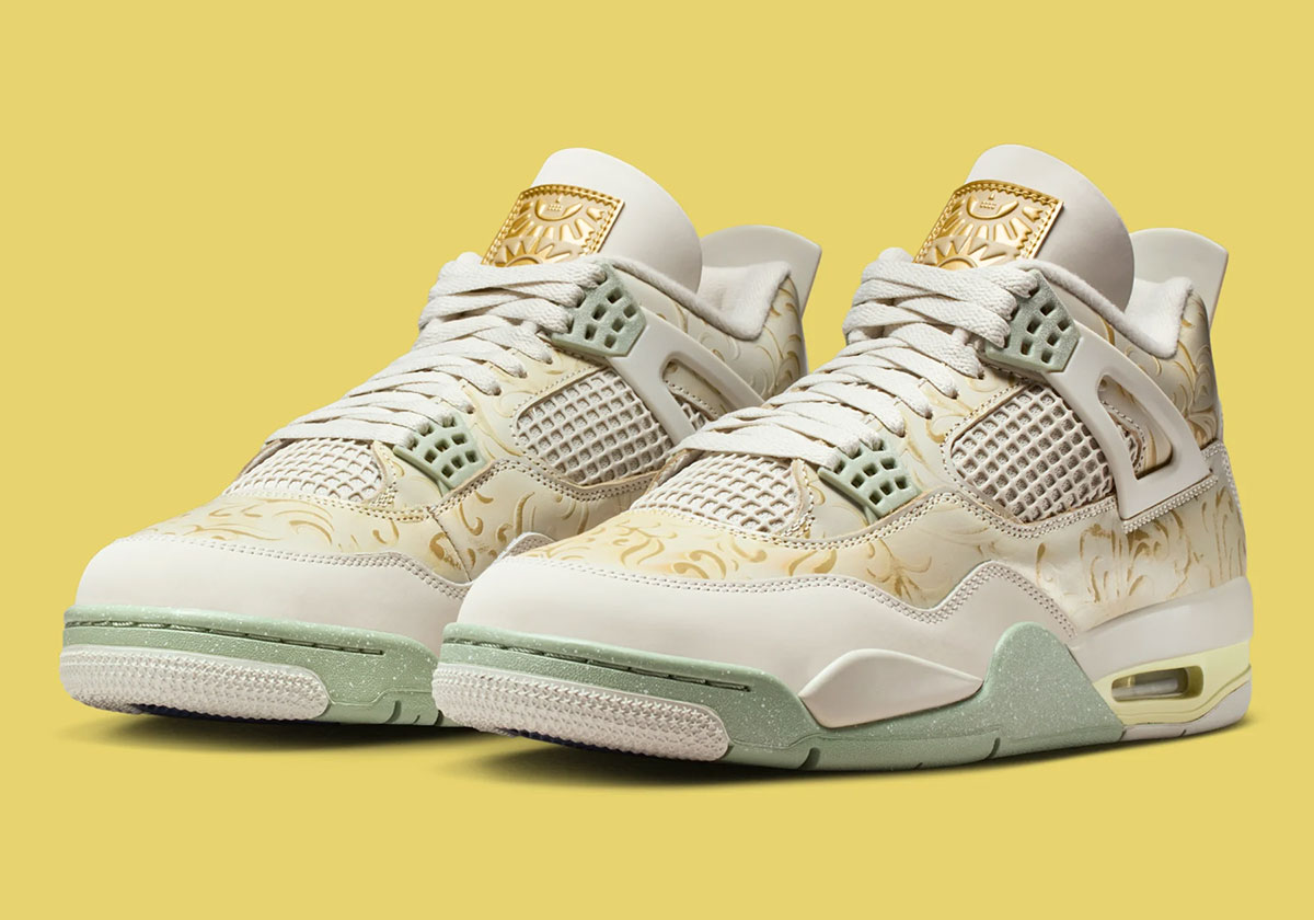 If you accept that grouping, said category is set to add what’ll no doubt be its most coveted edition to date, the Air Jordan 4 “Somos Eternos.” Marching on as the current belt holder in terms of overall hype and cultural cache, the Air Jordan 4 embraces the floral detailing worn by its aforementioned peers, with delicate branches spreading across an off-white upper. Pure white anchors those touches on the Wings, mudguard, collar, and outsole, while patches of “Seafoam” green touch the eye-stays and, notably, a speckled midsole. If you doubt the “special edition” subtitle attached to this Air Jordan 4, peep the solar tongue tag, the attached bangles at the toe, or the packaging, cementing the “Somos Eternos” title and mirroring the dense geometry used throughout this shoe.
