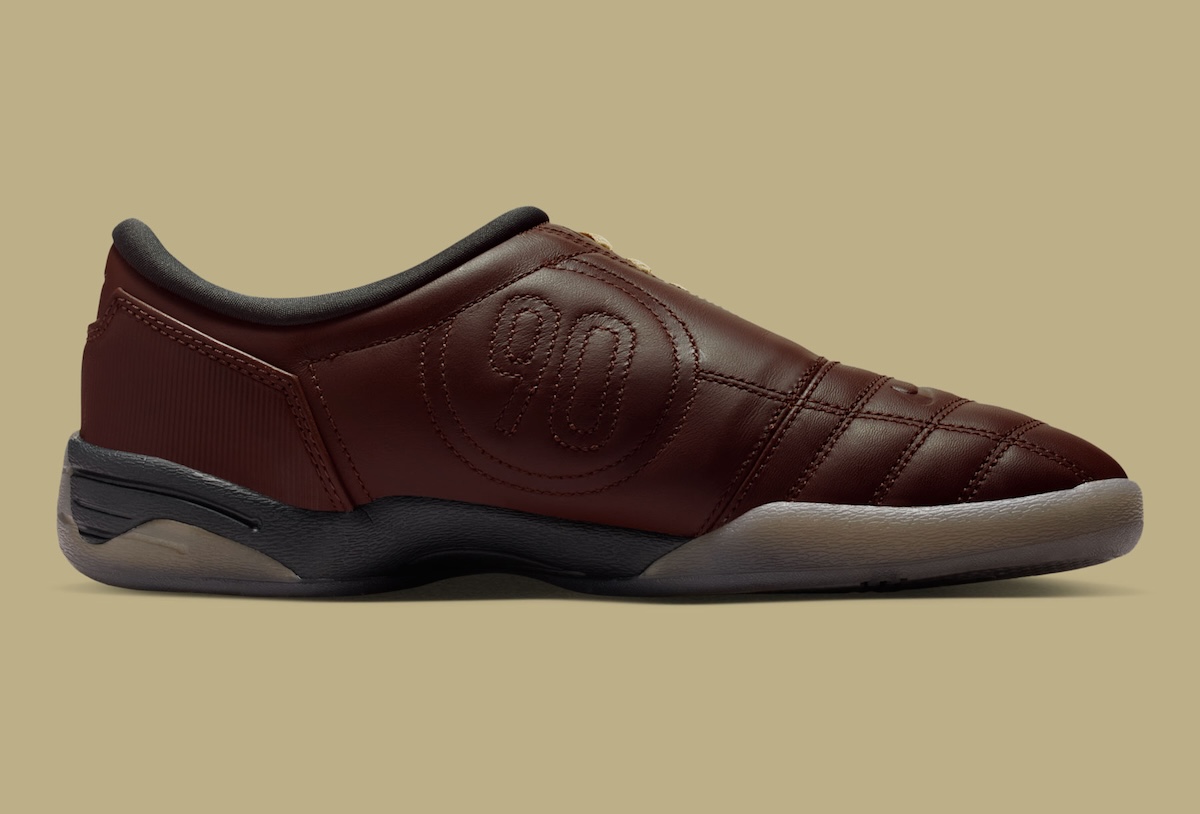 Appearing first as an indoor football boot, the T90 is back in high-end Baroque Brown leather upper treatment with its signature stitched silhouette and oversized “90” branding up and down the side.
