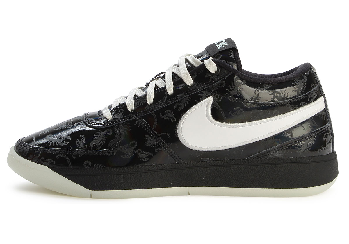 Depicted in retailer shots and a social media in-hand look, the Nike Book 1 “Halloween” opts for a glossy leather in this year’s take, coated in an all-over scorpion print that alludes to Booker’s late October birthday and resulting Scorpio sign. While that and an overall black/white colorway, aligning with the Nike KD 18 “Halloween,” makes for a sensible celebratory pair, the true draw just might be the lenticular/rainbow finish, somehow allowing for this monochromatic edition to become one of the more eye-catching in Book’s canon. For one final piece of intrigue, the man himself stopped into that aforementioned IG unboxing to note that there’s some finer detailers at play when viewed under a blacklight.