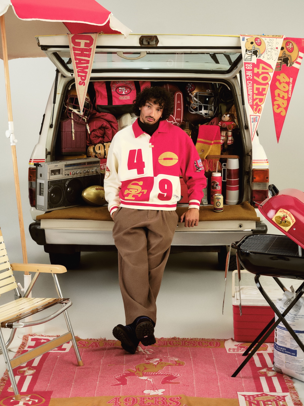 Curated with the Football Greats Alliance, the collection also honors NFL legends Jerry Rice, Lawrence Taylor, Mike Ditka, and Jim Kelly. Pieces include Vintage Tees, Bomber Jackets, and Sweaters with the players’ names in bold team colors, appliqué patches, and intricate ’90s inspired embroidery.