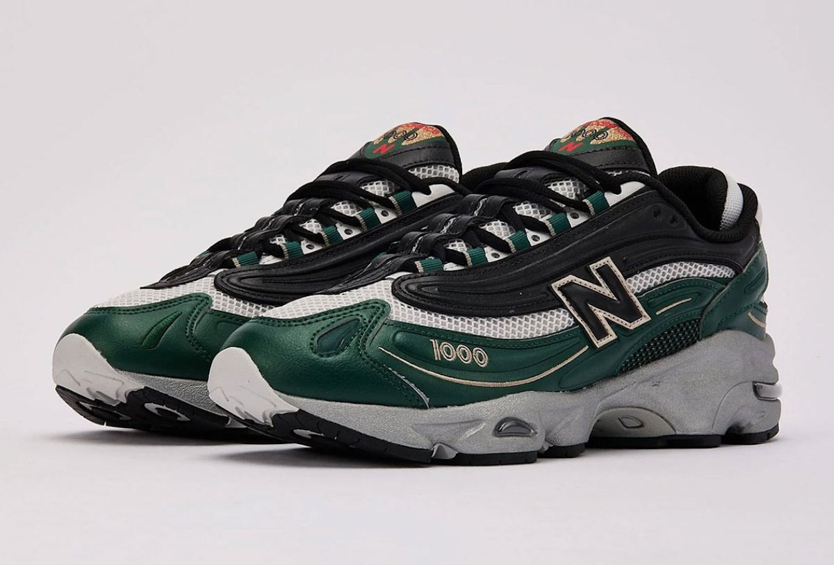 Dark green, black, white, and metallic silver highlight this spirited colorway, blending school team swagger with premium cool. This varsity look features an array of leather overlays and mesh panels for structured support that’s sure to keep your feet comfy all day long. Cream contrast stitching and gold “1000” embroidery give the shoe some upscale contrast.