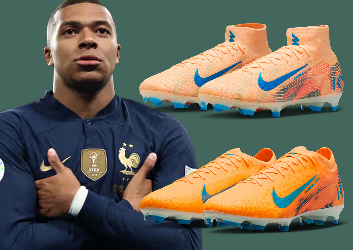 Studs tips and Swooshes in bright blue, along with Zoom Air callouts, contrast against the orange upper to further accentuate the vivacious sense of energy and movement. The shoe’s design evokes Mbappé’s fearless and imaginative playstyle both on the field and in everyday life.