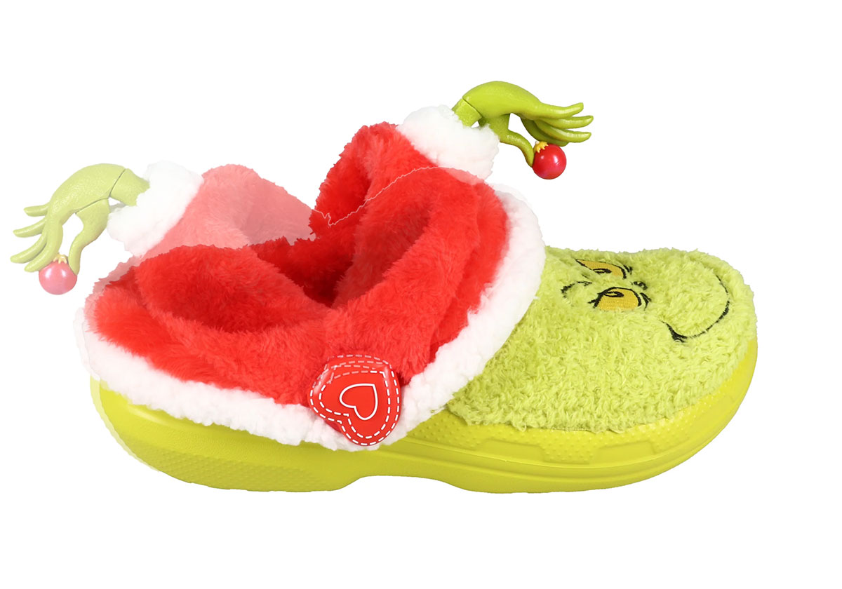 The Classic Clog here does its best impression of the furry, humanoid creature with a shaggy green forefoot featuring stitching for the Grinch’s face. His signature Santa Claus outfit — which he wears to sneak into homes and “steal Christmas” — materializes through red fuzzy interior lining. The defining detail, as most will likely agree, is a Grinch hand attached to the backtab, clutching a red ornament in classic “stealing Christmas” fashion. The hand can swivel so it’s not intrusive whether you’re wearing the clog normally or in sport mode.