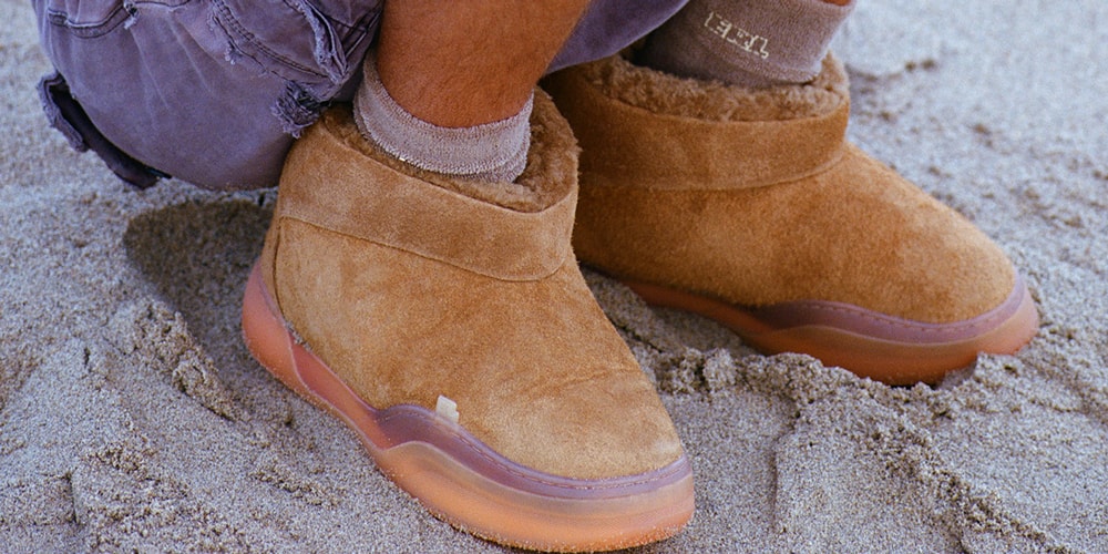 Underneath the minimalist suede exterior, a semi-transparent gum sole provides a subtle, branded element by revealing the ERL logo. Linnetz’s attention to detail extends to the packaging: the boots arrive in boxes made from the same corrugated material used by the US Postal Service, transparently showing the interior wrapping printed with archival images from 1970s Venice Beach underground newspapers.