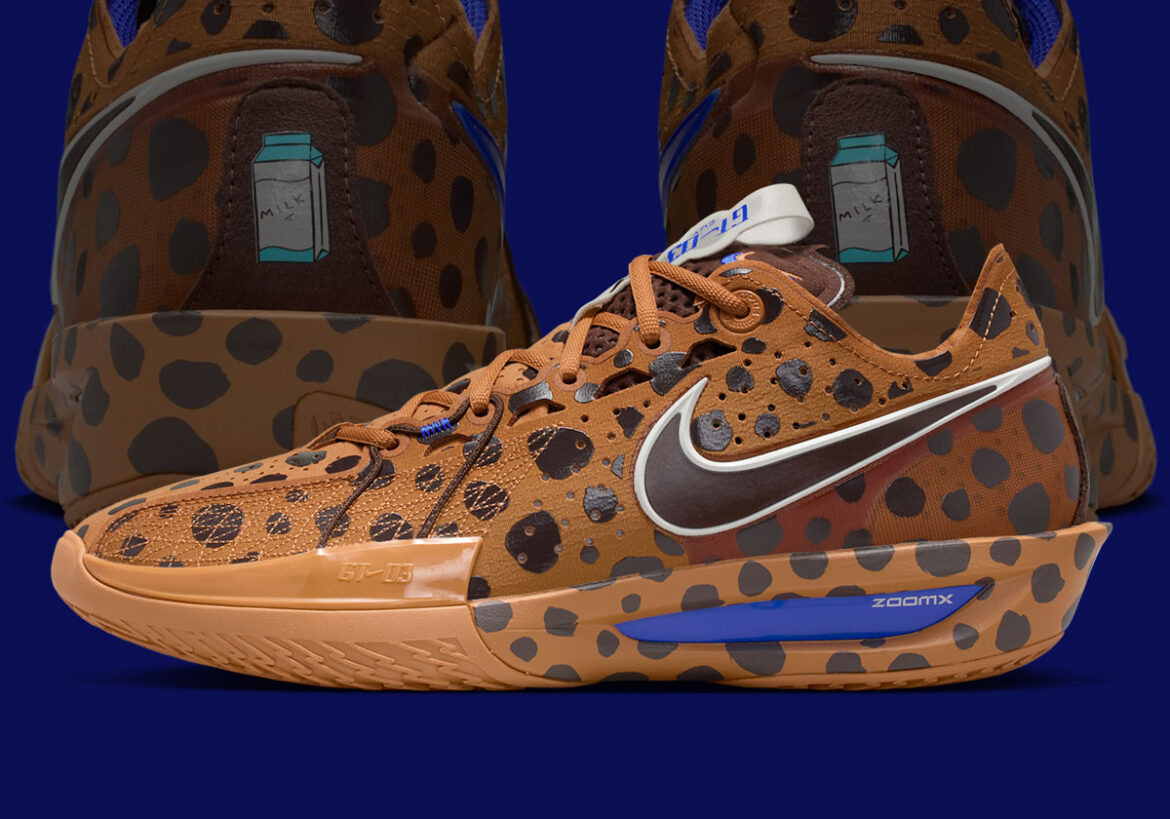 An exact match to the pair Jordan himself sported on-court, the sneaker features a light brown background with darker splotches representing chocolate chips, appearing on both the upper and heel portion of the midsole. Blue hits on the tongue tag, lining, ZoomX cushioning, and medial Swoosh tie in with milk cartons, while a hand-drawn carton illustration appears at the center of the heel.