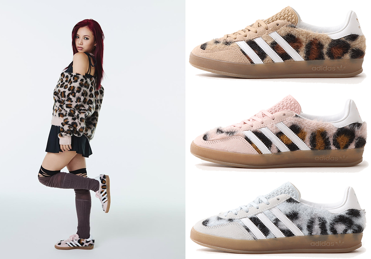 Revealed with the help of J-Pop outfit iScream (shown modelling this collection below), the broad strokes of these materially swapped versions are easy to grasp. Furry, sized-up leopard print coats the mohair body of each shoe, held together by suede toes and lace units. To uphold the “Trinity” aspect, a triumvirate of delicate shading options is on tap, hitting on baby blue, light pink, and tan, the latter forging easily the most cohesive profile of the crop. Though not depicted in campaign shots, atmos Pink delivers co-branding on the interiors, a subtle juxtaposition of the Trefoil and the women’s sub-brand in black and white.