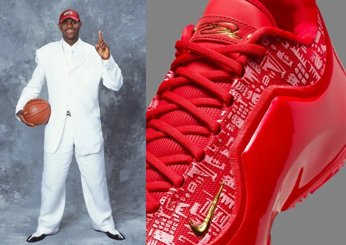 The colorway speaks volumes. Dressed entirely in University Red, the sneaker features intricate reflective graphics inspired by LeBron’s career milestones. The hand-drawn crown design is a tribute to his “King James” nickname, while the bitten apple logo on the heel is a reference to New York, also known as the “Big Apple,” where James was drafted and changed the course of his career. Gold accents on the Swoosh and LeBron’s signature on the tongue add a luxurious touch befitting of a king.
