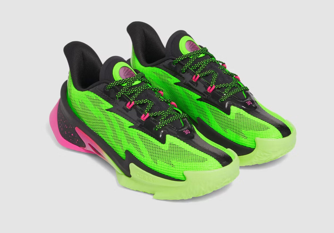 Though a bit more in-your-face than the actual light display, it’s not hard to see how Aurora Borealis inspires this version of the Curry Brand Series 7, pulling both its “Hyper Green” and “Rebel Pink” from the bucket list phenomenon. Helping ease the gradient between either highlighter shade is a patch of fire red partially supported by trim notes around the eyestays. There, you’ll also spot the black anchoring that prevents this colorway from going too gaudy.