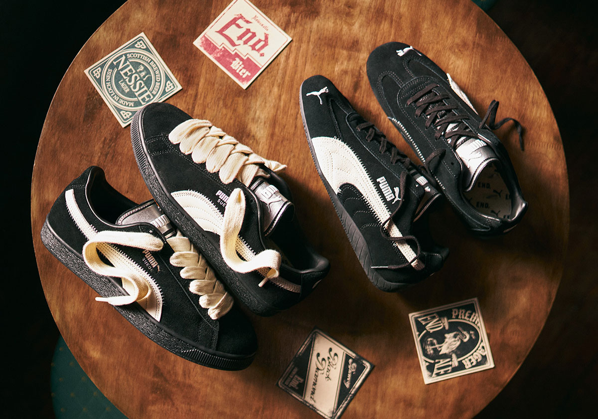 Within those bounds, the two imprints rely on rather staid tones but elevate either shoe in the details. Both the Speedcat and Suede wear black-and-white color schemes with aged, off-white lace options, leaning into a chunkier, trendier direction with the Suede. Exposed stitching around the profile adds an extra layer of character, while silver metallic tongues speak to the celebratory air that’s paced all of END.’s output in 2025.