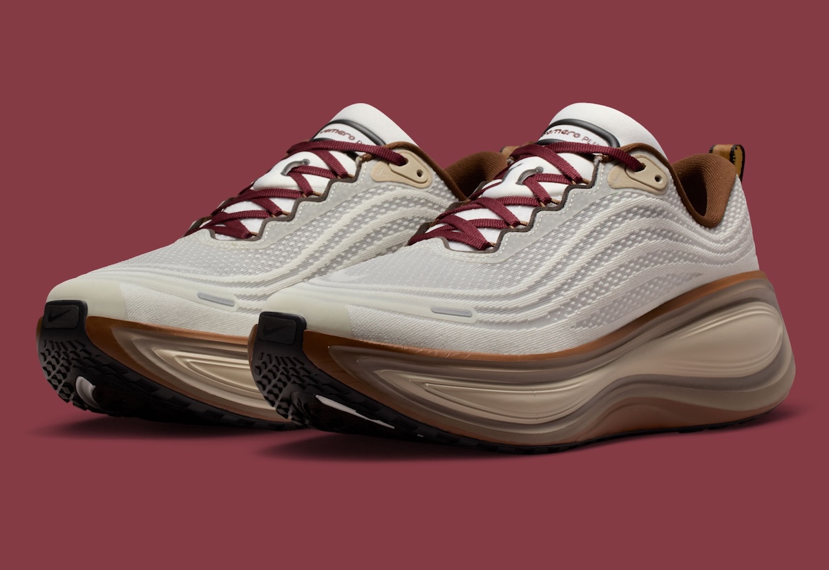 The upper combines a Sail mesh with wave-stitching seen on earlier Vomero shoes, while the contrasting collar and heel tab in Caldera Brown helps define the fit. A darker burgundy lace adds even more contrast and distinction from the otherwise neutral color palette.