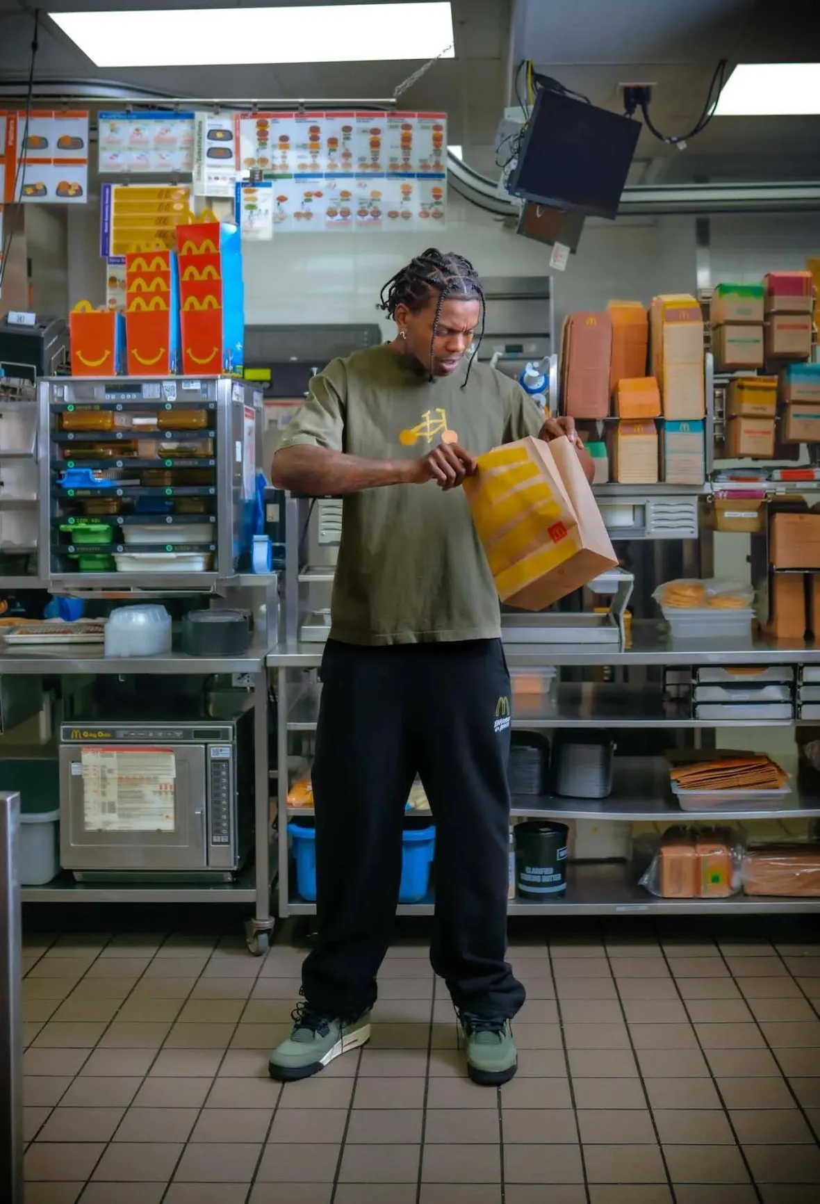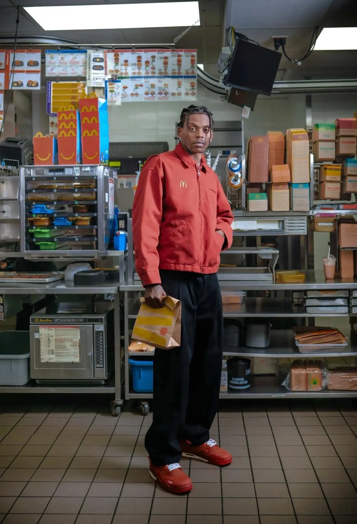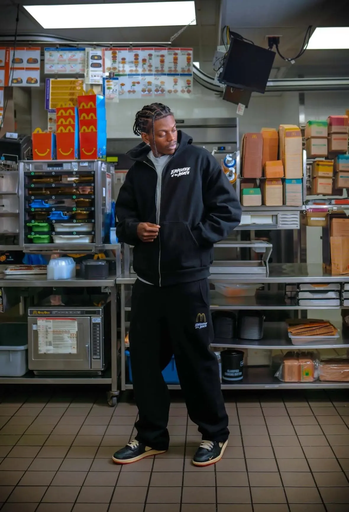 This new “Employee of the Month” project plays with that memory while elevating it through streetwear cues. The collection uses familiar McDonald’s visuals, but the styling feels sharper than a typical nostalgia drop. It leans into workwear silhouettes, clean embroidery, and bold graphics, creating pieces that speak to ambition as much as uniform culture. The concept works because it reflects a real moment from Sylvester’s past, not a manufactured campaign.