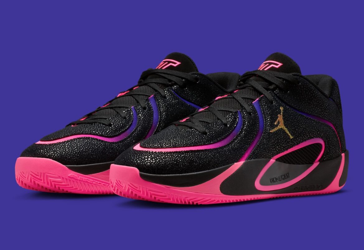 The base starts in black pebbled material, but that’s only the foundation. Pink, purple, and blue neon tones cut across the upper in a flowing gradient that feels more expressive than previous Tatum colorways. Underfoot, a bright pink outsole keeps that energy moving, while the matching JT logo on the black suede tongue locks in the theme.