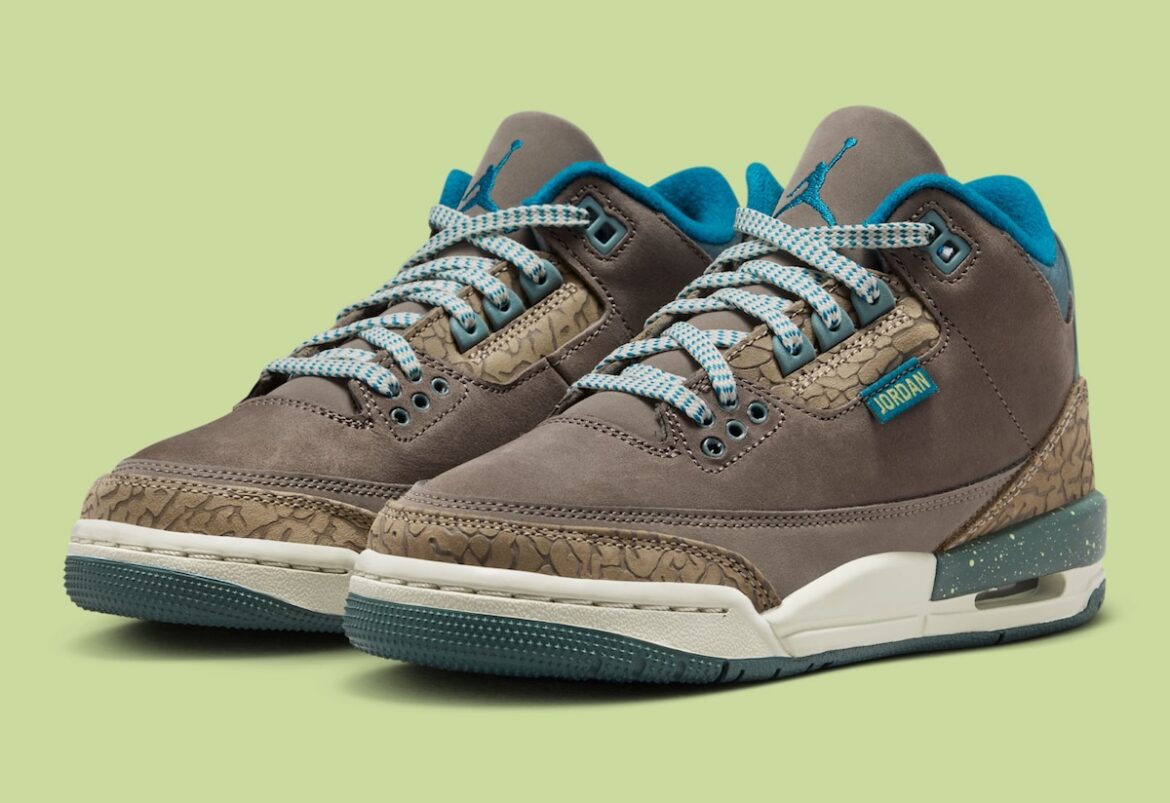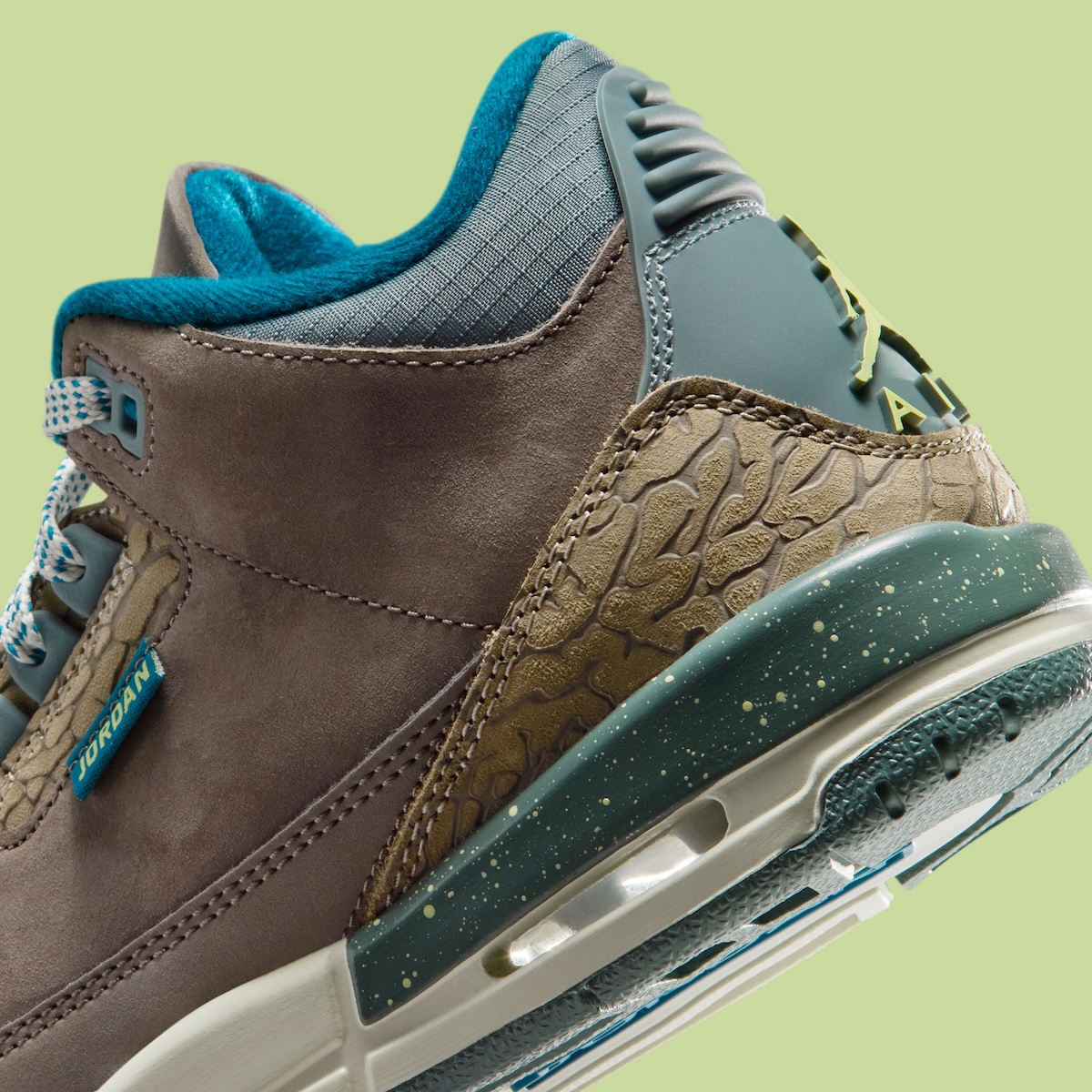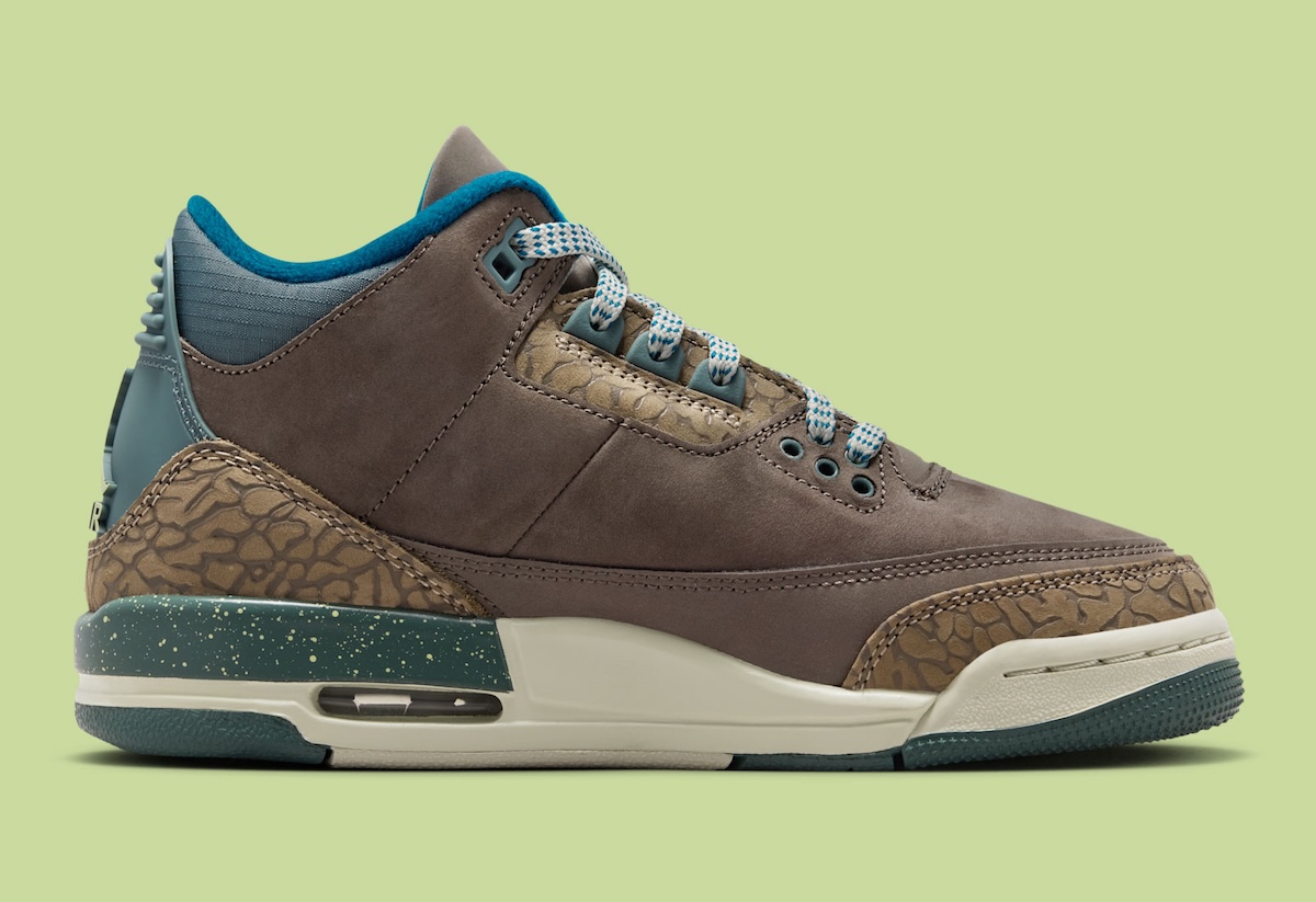The upper arrives in brown nubuck, giving the Air Jordan 3 a grounded, seasonal look. Elephant print stays in place at the toe and heel, keeping the shoe anchored to its 1988 roots. Teal accents line the collar, eyelets, and Jumpman logo, adding contrast without breaking the palette.