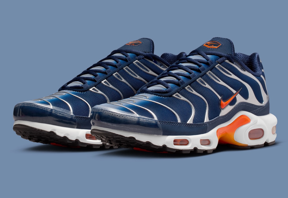 The upper is wrapped in deep navy shades, keeping the profile clean and controlled. Safety Orange details cut through the palette at the branding, midfoot shank, and visible Air Max cushioning. That contrast recalls earlier Nike Air Max Plus colorways built for visual impact, especially during the silhouette’s peak streetwear run.