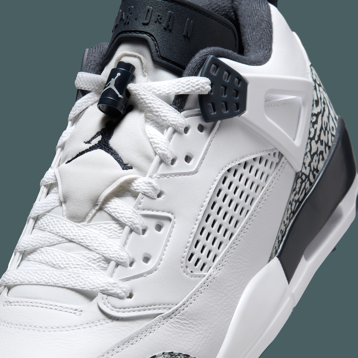 Dressed in White, Pure Platinum, and Obsidian, the shoe recalls early-2000s Jordan releases. The Spizike itself debuted during that same hybrid-heavy period. Familiar elephant print accents and layered panels remain intact, reinforcing its crossover identity rather than disguising it.