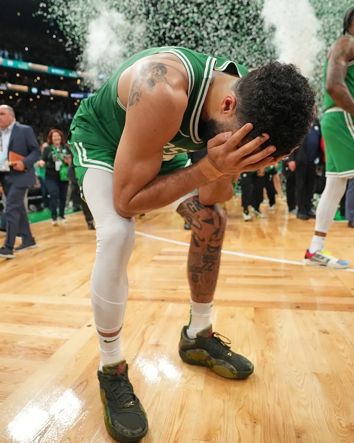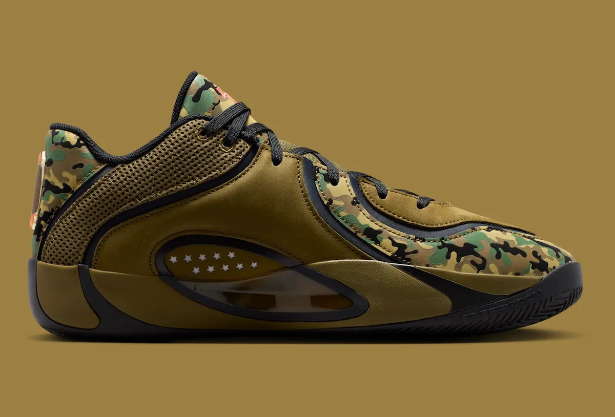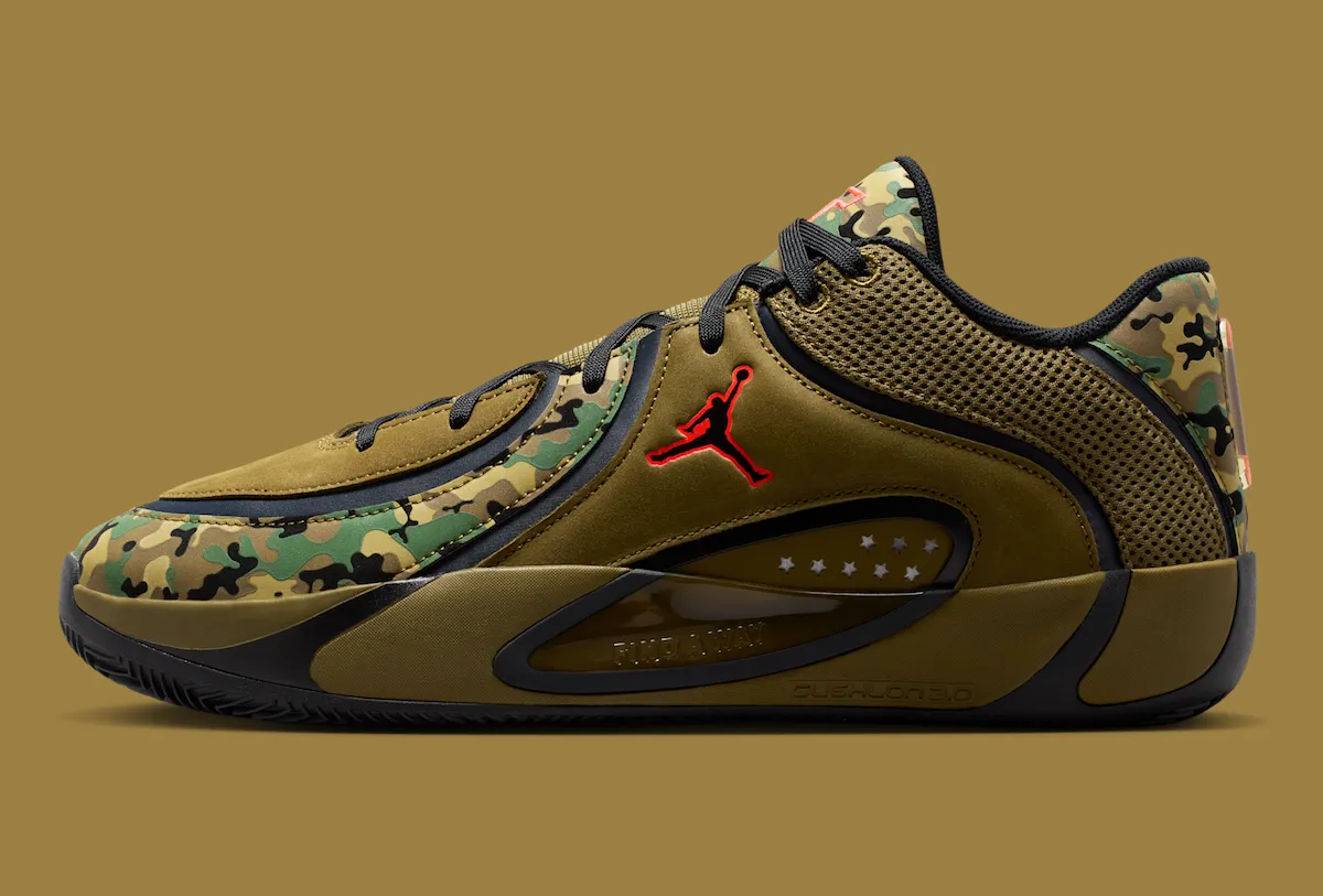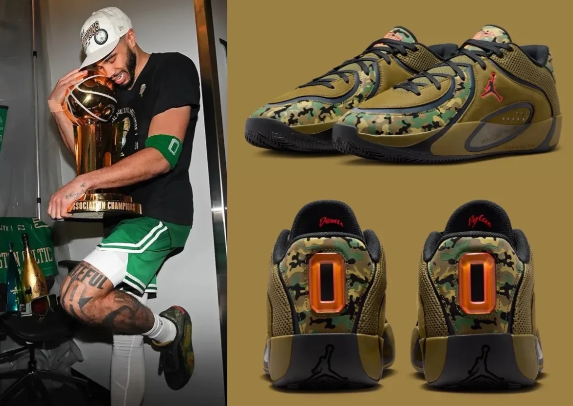 Jordan Brand is using All-Star Weekend momentum to spotlight the next chapter of Jayson Tatum’s signature line. The Jordan Tatum 4 “First Ring” draws directly from the camo Tatum 2 PE he wore during Boston’s championship run, translating that personal moment into a retail colorway.
