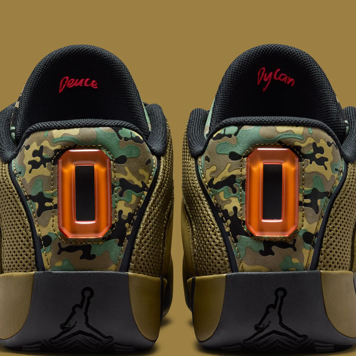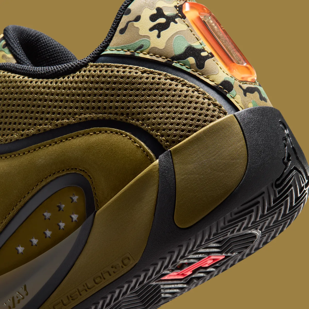 The upper leans heavily into outdoor cues. Black, green, and tan camouflage wraps the toe and tongue, while olive suede and breathable mesh stabilize the build. Dark panel dividers frame the design, giving the camo room to breathe rather than overwhelm. Infrared accents on the lateral Jumpman and JT tongue logo sharpen the contrast.