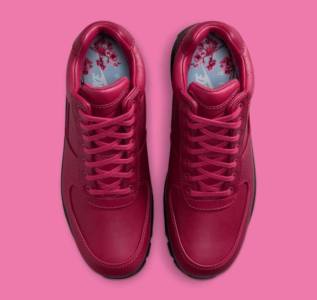 Underfoot, visible Air cushioning modernizes the ride. Aggressive black traction grounds the look. Inside, cherry blossom insoles add contrast and cultural texture.