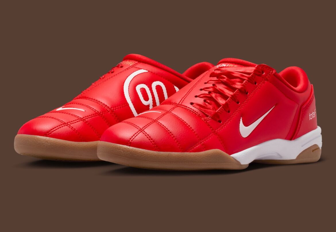 The Nike Total 90 III “University Red” emerges as a women’s-exclusive release, reconnecting with Nike’s early-2000s football era. The bold red upper, paired with gum brown and metallic gold accents, immediately recalls the Total 90’s original on-pitch presence. Still, this version clearly shifts toward lifestyle wear.