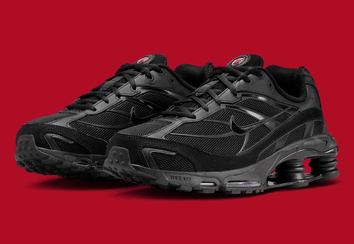 Down below, the Ride 2 cushioning remains the visual anchor. The mechanical heel columns stay fully blacked out, reinforcing the stealth direction. Meanwhile, red and white Shox branding on the tongue and heel adds just enough contrast.