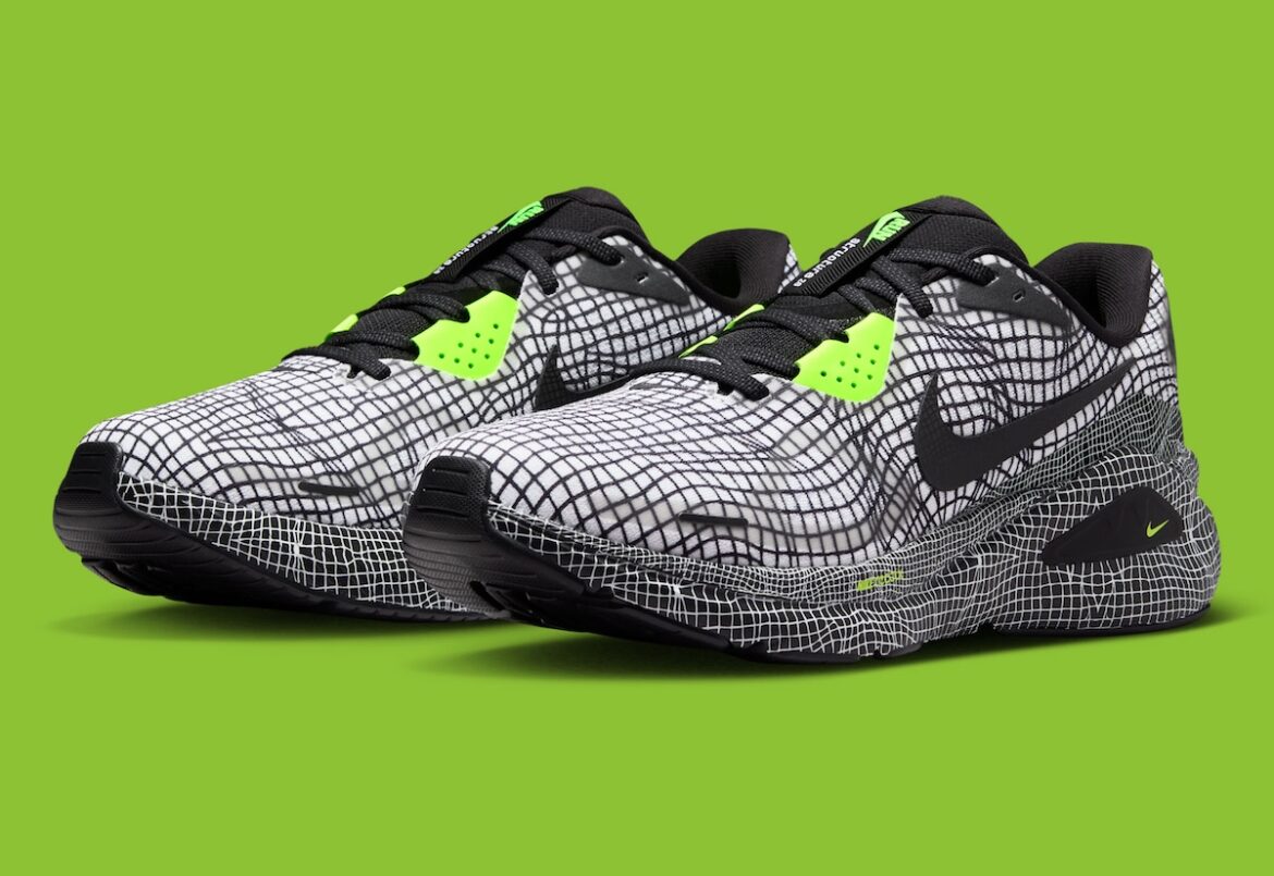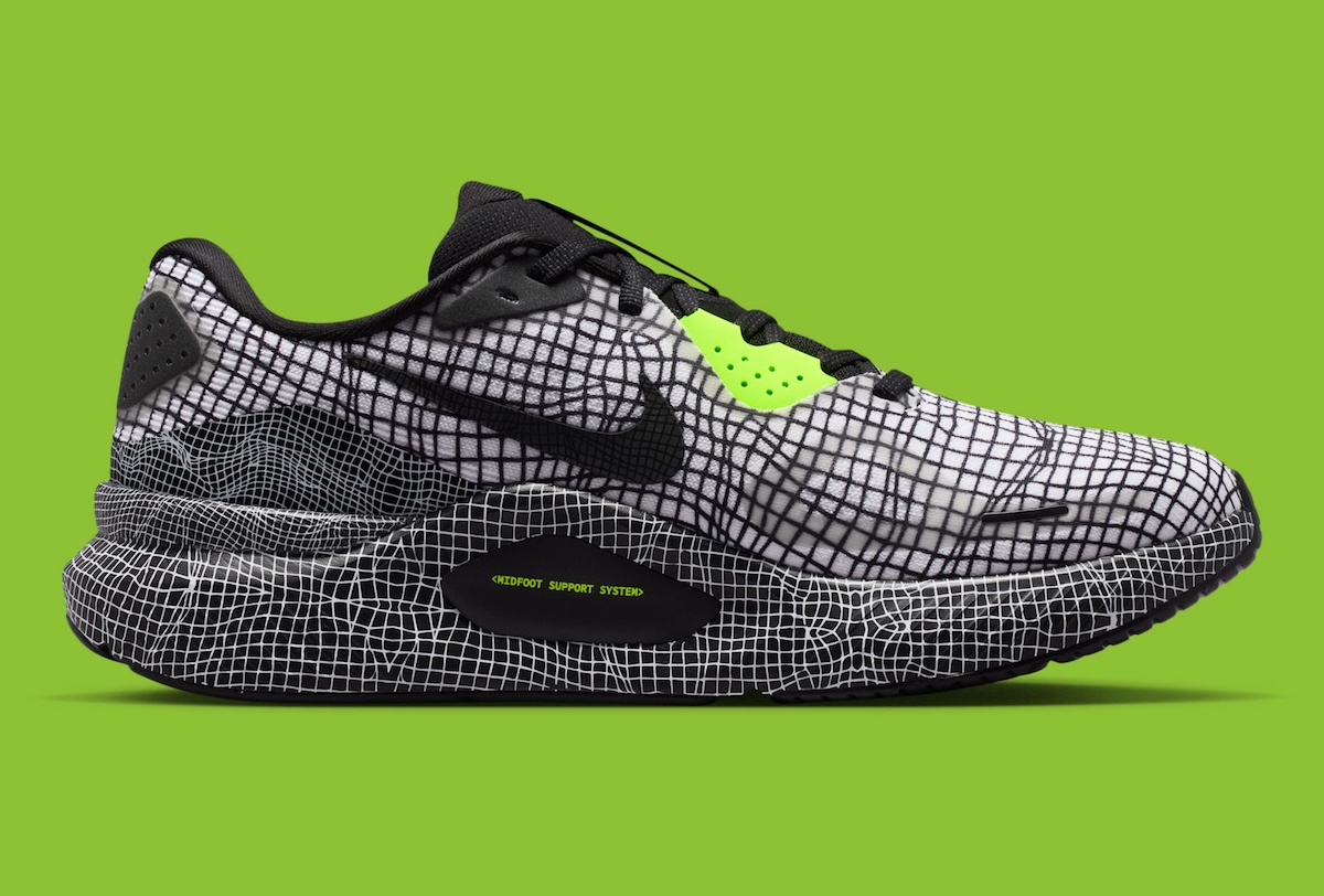 White mesh handles the base. A black grid sits over it, giving the upper a technical look that feels planned, not decorative. The Swoosh stays black and quiet. Volt shows up sparingly, mostly around the eyelets, tongue, and midsole. It works because it doesn’t try too hard.